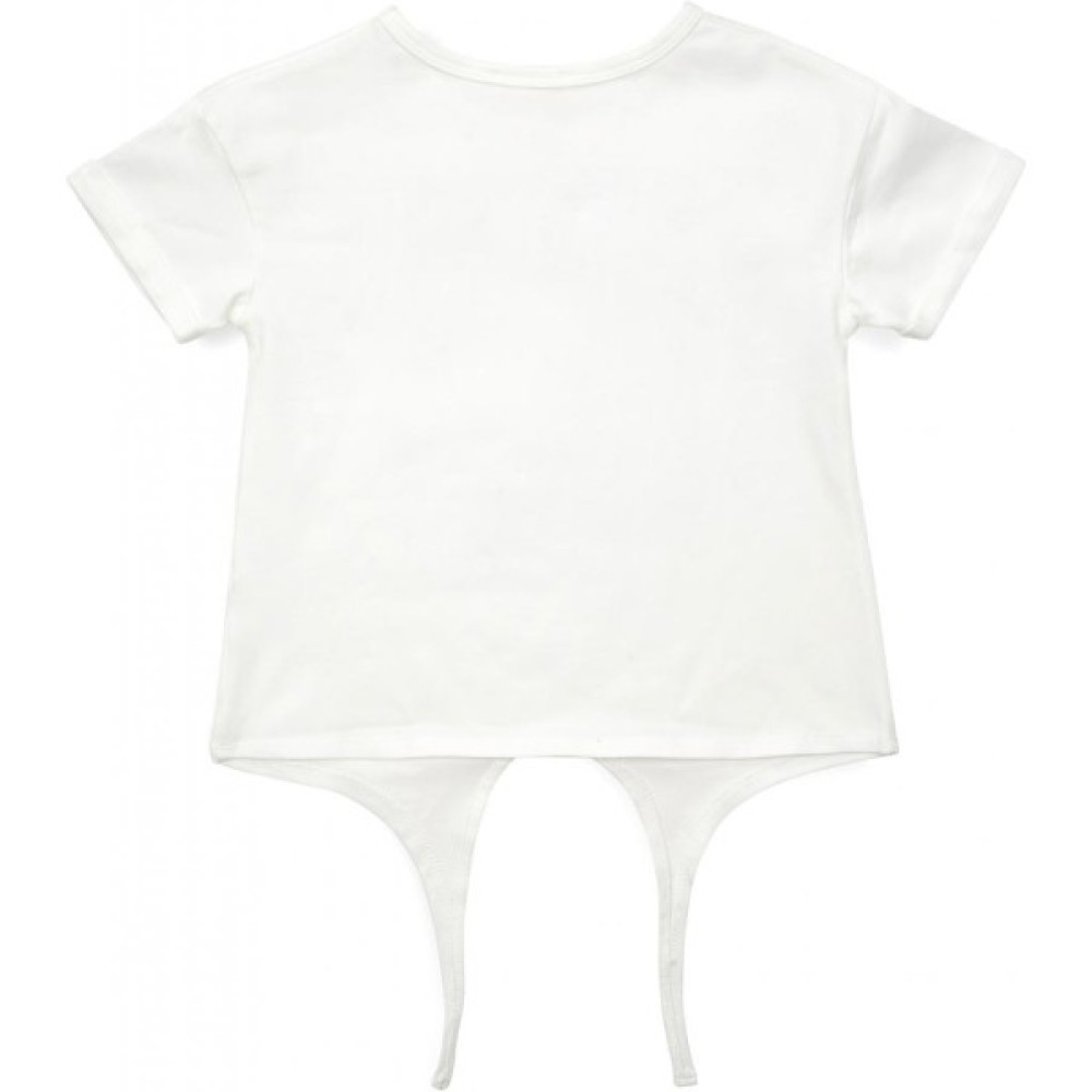 Стильна молочно-біла футболочка, прямого силуету з подовженою лінією плеча і суцільнокроєними зав'язками по низу для вашої юної модниці.