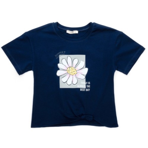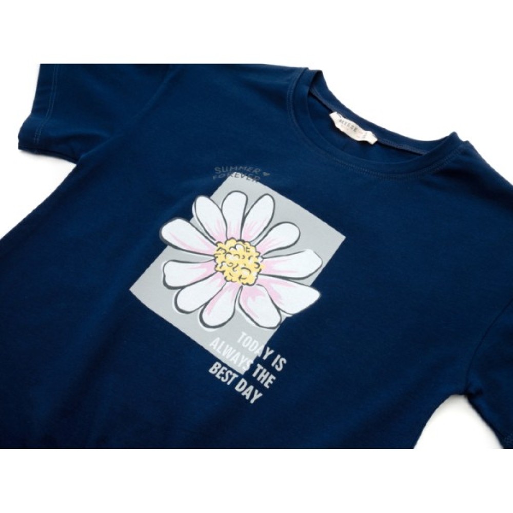• Літня темно-синя футболочка для дівчинки з якісного ніжного турецького трикотажу, прикрашена яскравим ефектним симпатичним принтовим малюнком у приємній кольоровій гамі, з цікавою ефектною призібраною деталлю спереду по лінії низу.