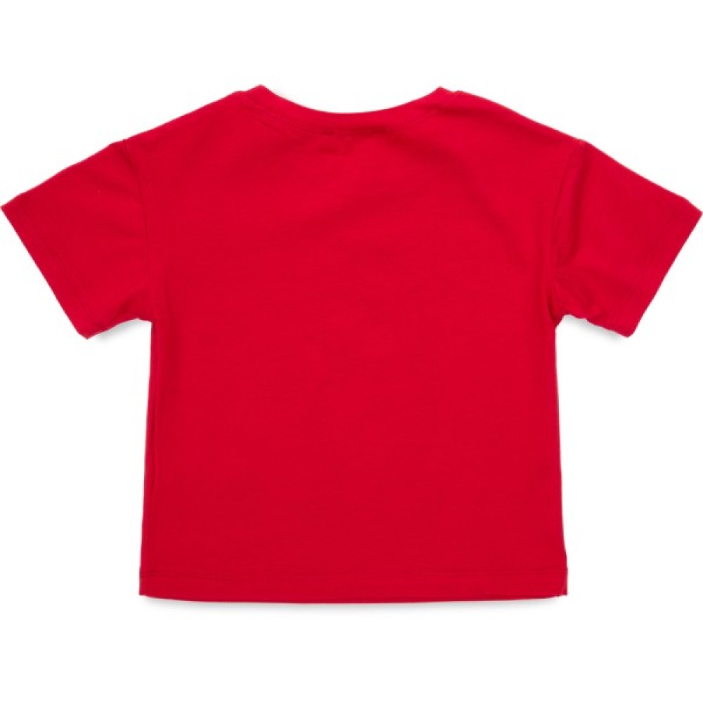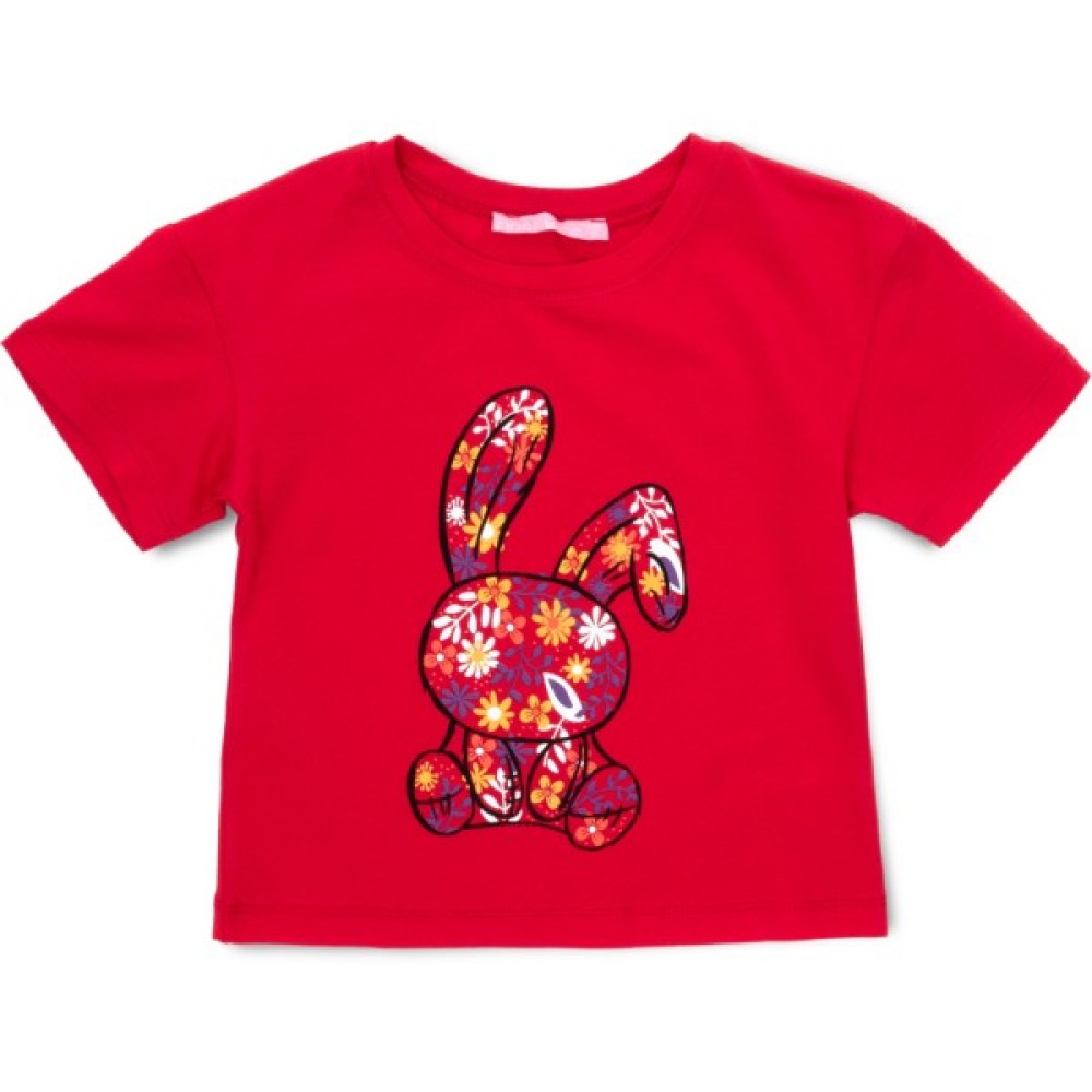 Укорочена футболочка насиченого червоного кольору, вільного крою, з якісного турецького трикотажу, прикрашена яскравим ефектним принтовим малюнком зайчика в квітах, без сумніву, сподобається вашій юній модниці.