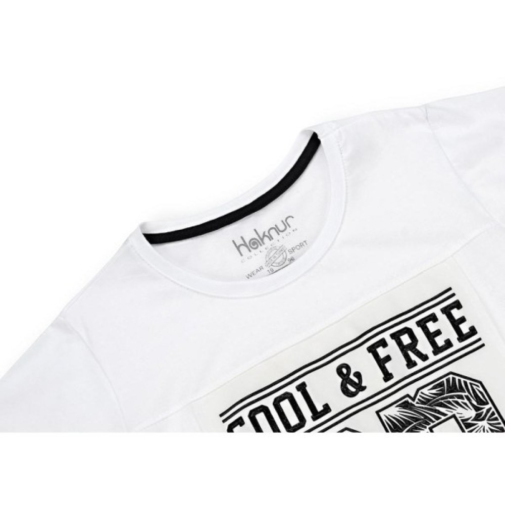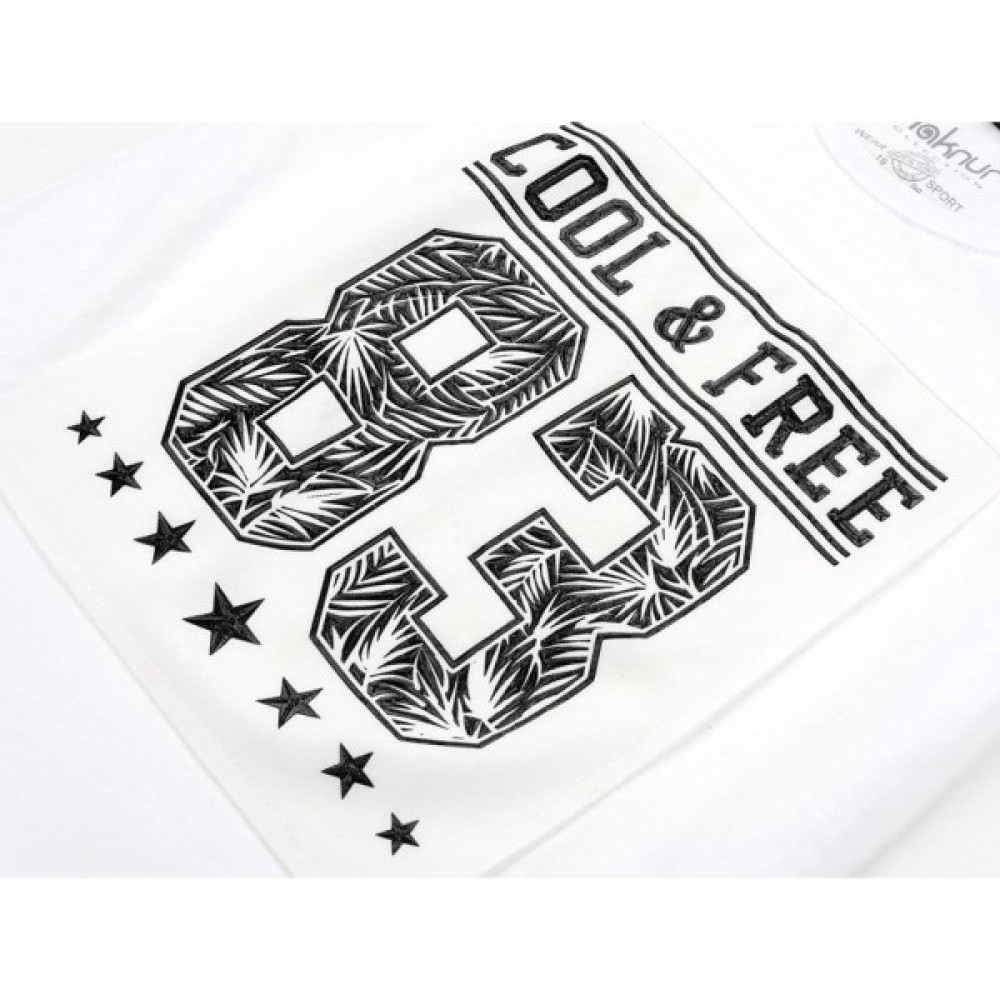 Ефектна, вільного крою футболка з короткими рукавами, ошатного сніжно-білого кольору. Прикрашена нашитим поверху полички стильним, об'ємним, якісним принтом молочного забарвлення з прогумованим написом «COOL & FREE». Горловина кругла, оброблена м'якою трикотажною резинкою.