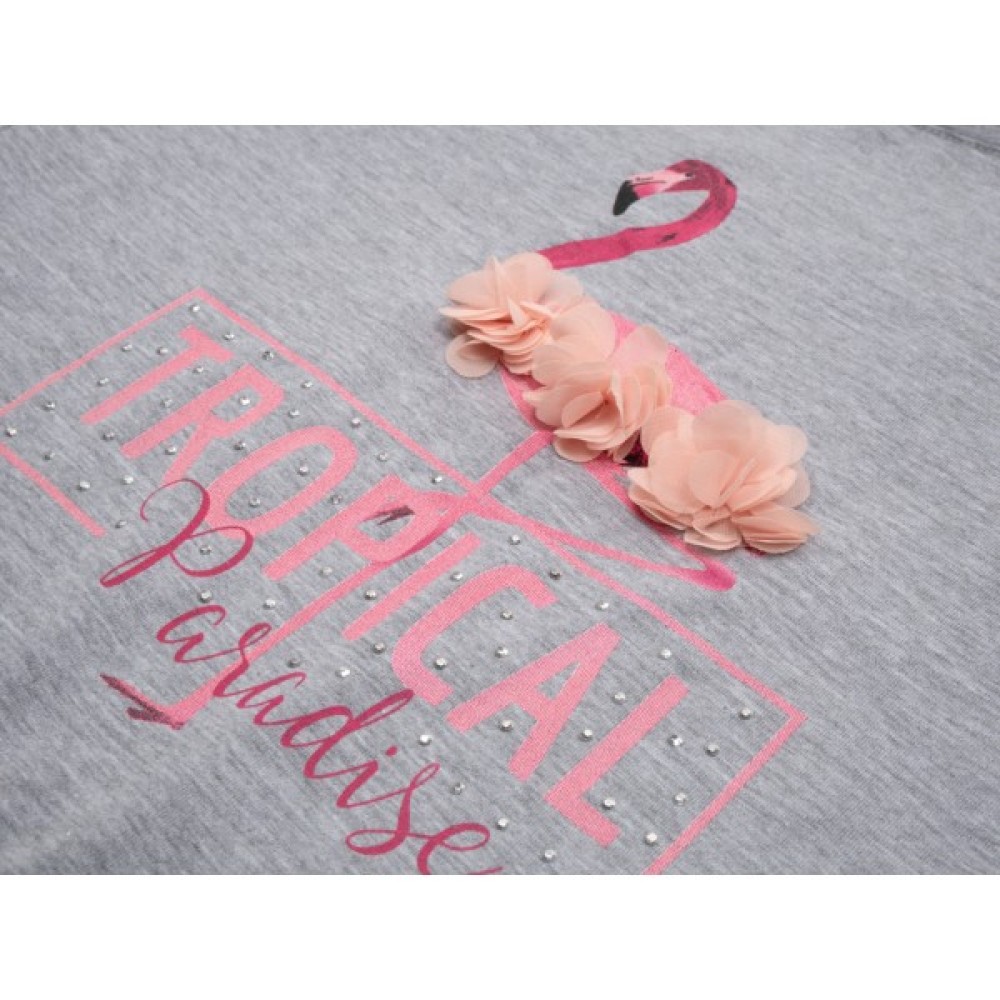 Спереду футболка прикрашена яскравим, кольоровим, принтовим малюнком фламінго, оформленим стразами та шифоновими пришивними квіточками.