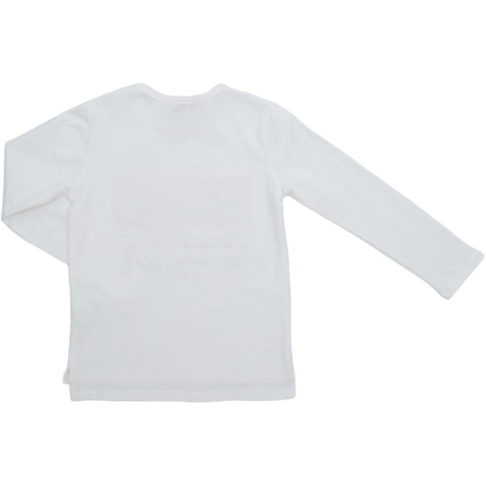 Симпатичний, стильний лонгслів з асиметричною лінією низу, з довгими рукавами та ефектним принтовим малюнком, доповненим блискучими сріблястими стразами для вашої модниці.