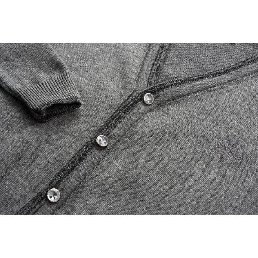 Однотонна, тонка, в'язана лицьовою гладдю, трикотажна меланжева кофта сірого кольору з довгим рукавом - один з предметів базового гардеробу, який можна носити практично з усіма речами. Зліва на грудях невелика вишивка. По V-подібній горловині і по застібці-планці - подвійна, а по низу кофти і рукавів - одинарна, еластична тонка гумка з додаванням по краях смуг чорного, блискучого, тонкого люрексу. Красиві круглі оригінальні ґудзики, які за формою нагадують дорогоцінні сріблясті кристалики, в цій моделі не тільки функціональний, але і декоративний елемент, який розбавляє класичний образ, створений однотонною кофтою, та надає їй оригінальності і привабливості.