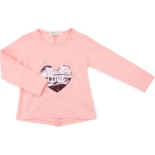 Лонгслів персикового кольору, прикрашений класною деталлю - виконаним з паєток малюнком у вигляді серця з написом в середині. Малюнок змінює колір, якщо по ньому провести рукою.