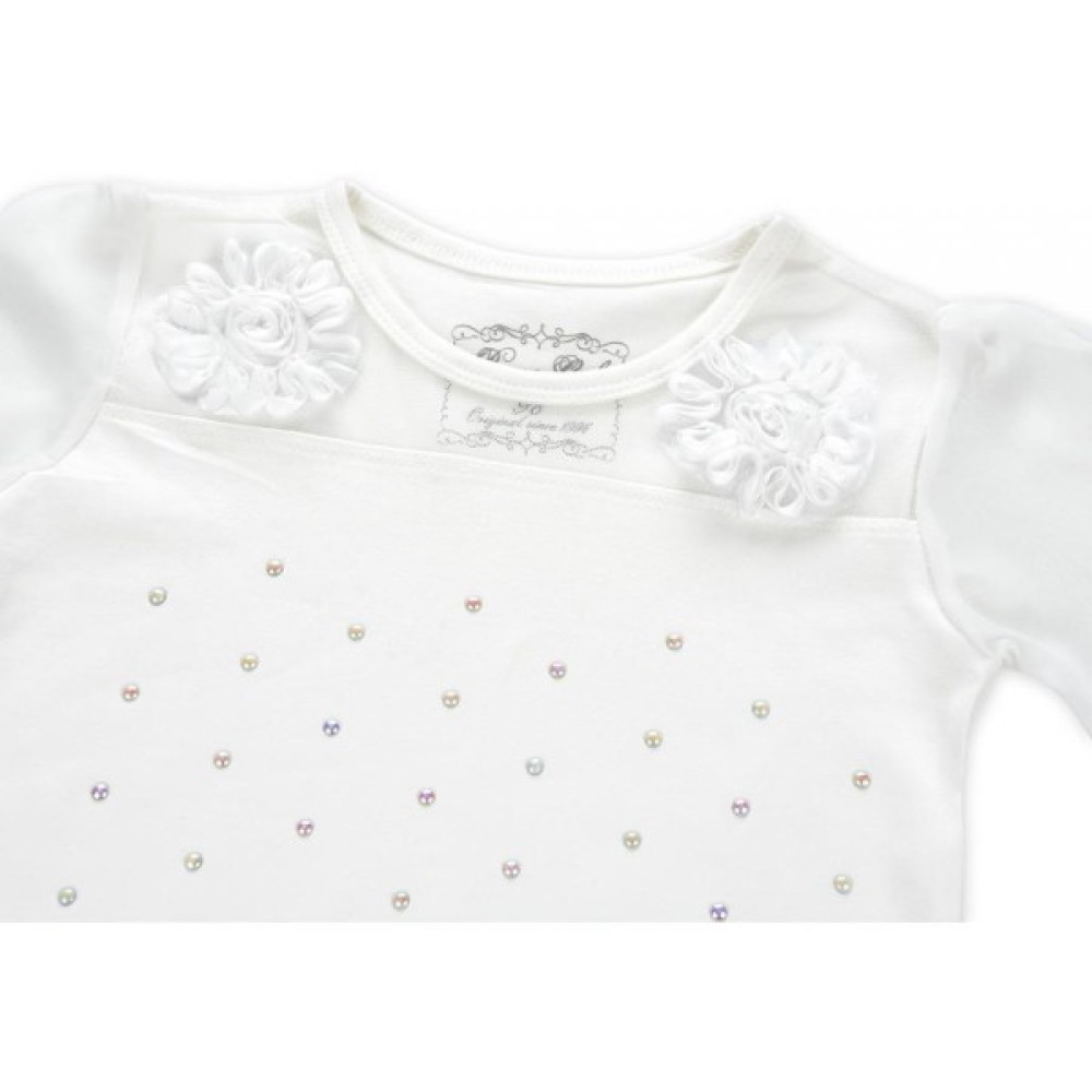 Красива кофта молочного кольору злегка А - образного крою з круглою горловиною, окантованою трикотажною бейкою. Перед і спинка виконані з трикотажного полотна, а довгі рукави з напівпрозорого шифону. Спереду кофточка прикрашена перламутровими полубусінамі і сітчастою кокеткою, на якій розташувалися милі квіти теж з шифону.