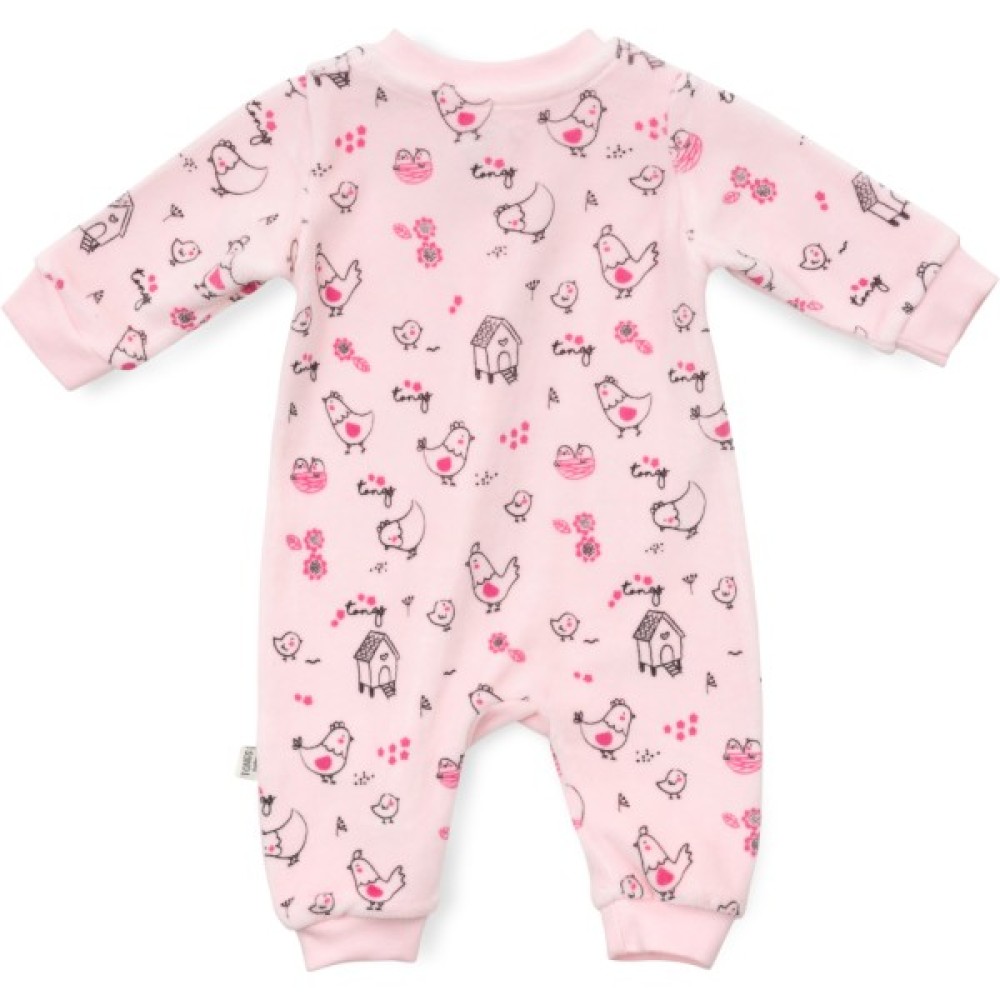 Прекрасний натільний комбінезон – «чоловічок» – дуже зручний та незамінний одяг для Вашої донечки. Колір ніжно - рожевий. Тканина щільна, але м'яка, приємна на дотик. Чоловічок по всій поверхні прикрашен графічними малюнками пташок і квіточок. Застібається на таємну блискавку з легким ходом. Вгорі є захист для підборіддя. Блискавка починається від центру горловини і спускається до низу лівої ніжки. Ніжки не зашиті, з трикотажними манжетами на щиколотках. Такий комбінезон ступні не прикриває, але зможе служити довше в міру зростання вашої малечі. Горловина та краї рукавів  виконані із трикотажної гумки.