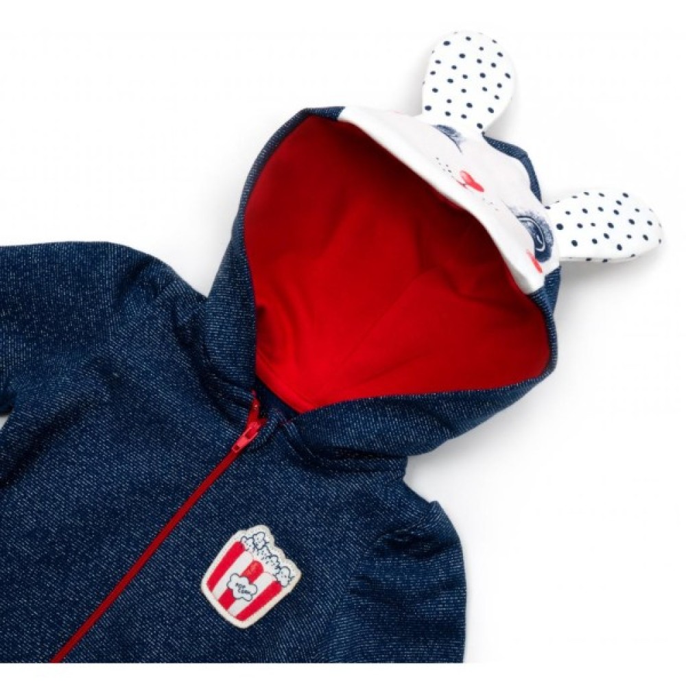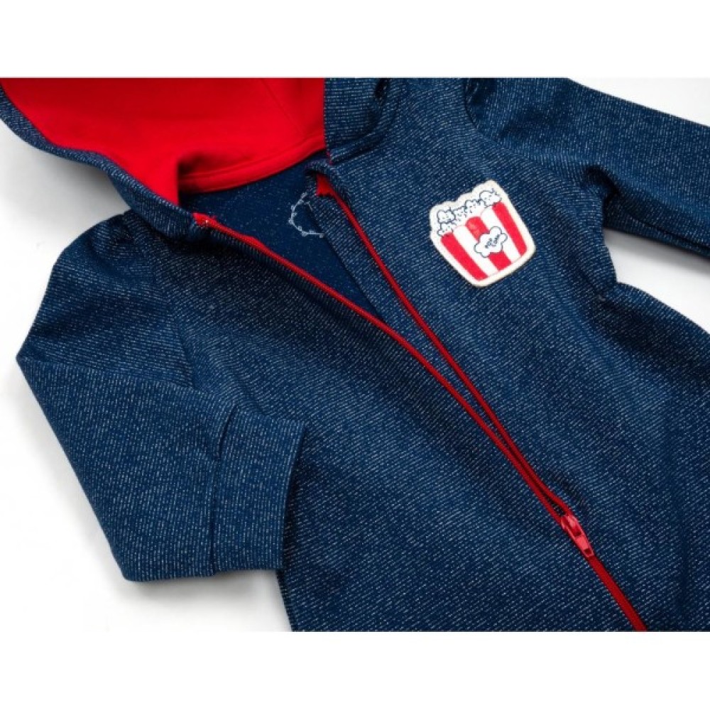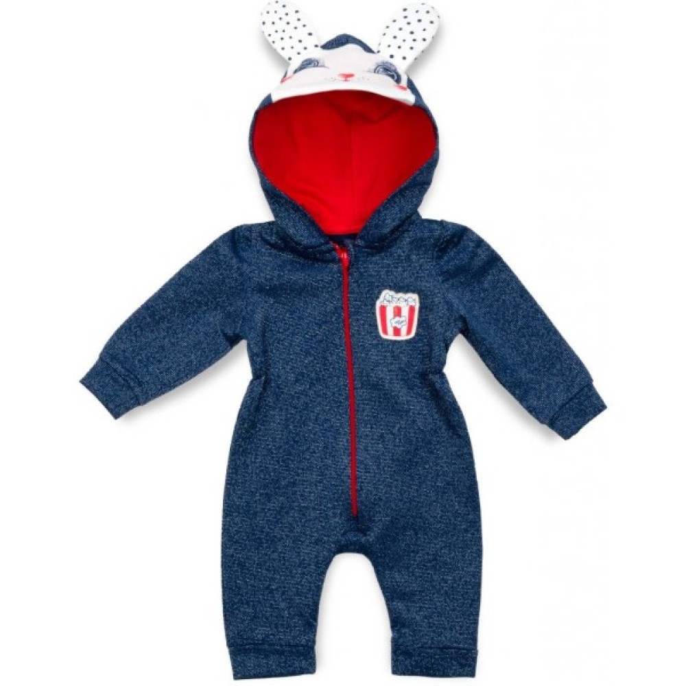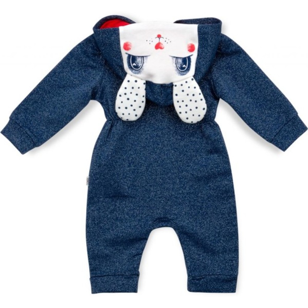 Комбінезон темно - синього кольору, в основу тканини додана срібляста нитка. Тканина дуже м'яка, не «кусається», приємна на дотик. Застібається на блискавку яскраво - червоного кольору. Вгорі є захист для підборіддя. Ніжки не зашиті, з трикотажними манжетами на щиколотках. Такий комбінезон ступні не прикриває, але зате зможе служити довше (у міру зростання малюка). Краї рукавів оброблені м'якою трикотажною резинкою. Родзинкою комбінезона є забавна мордочка зайчика з непришитими вушками, яка розташувалася на капюшоні. Капюшон подвійний, всередині на трикотажній підкладці красивого червоного кольору.