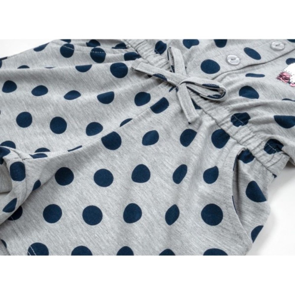 Дуже модна, стильна модель сірого меланжевого кольору в темно - синій горох, зшита з якісного турецького трикотажу на бавовняній основі, з додаванням невеликого % еластану для підтримки форми виробу. Тканина м'яка, дуже приємна на дотик.
