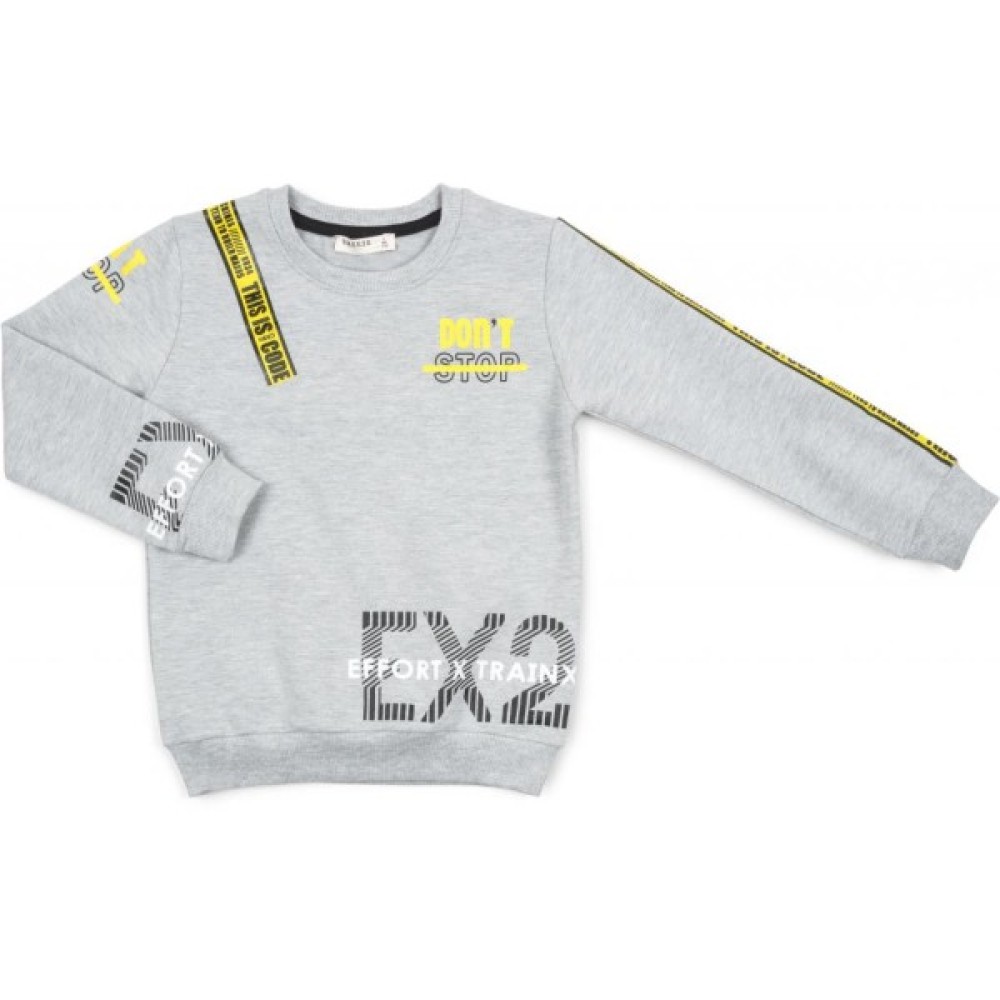 Вільний світшот прямого силуету прикрашений на грудях і на рукавах яскравими прінтованими написами яскраво - жовтого, чорного і білого кольорів. Кругла горловина, манжети довгих рукавів і низ світшота оброблені подвійною якісною трикотажною «гумкою».
