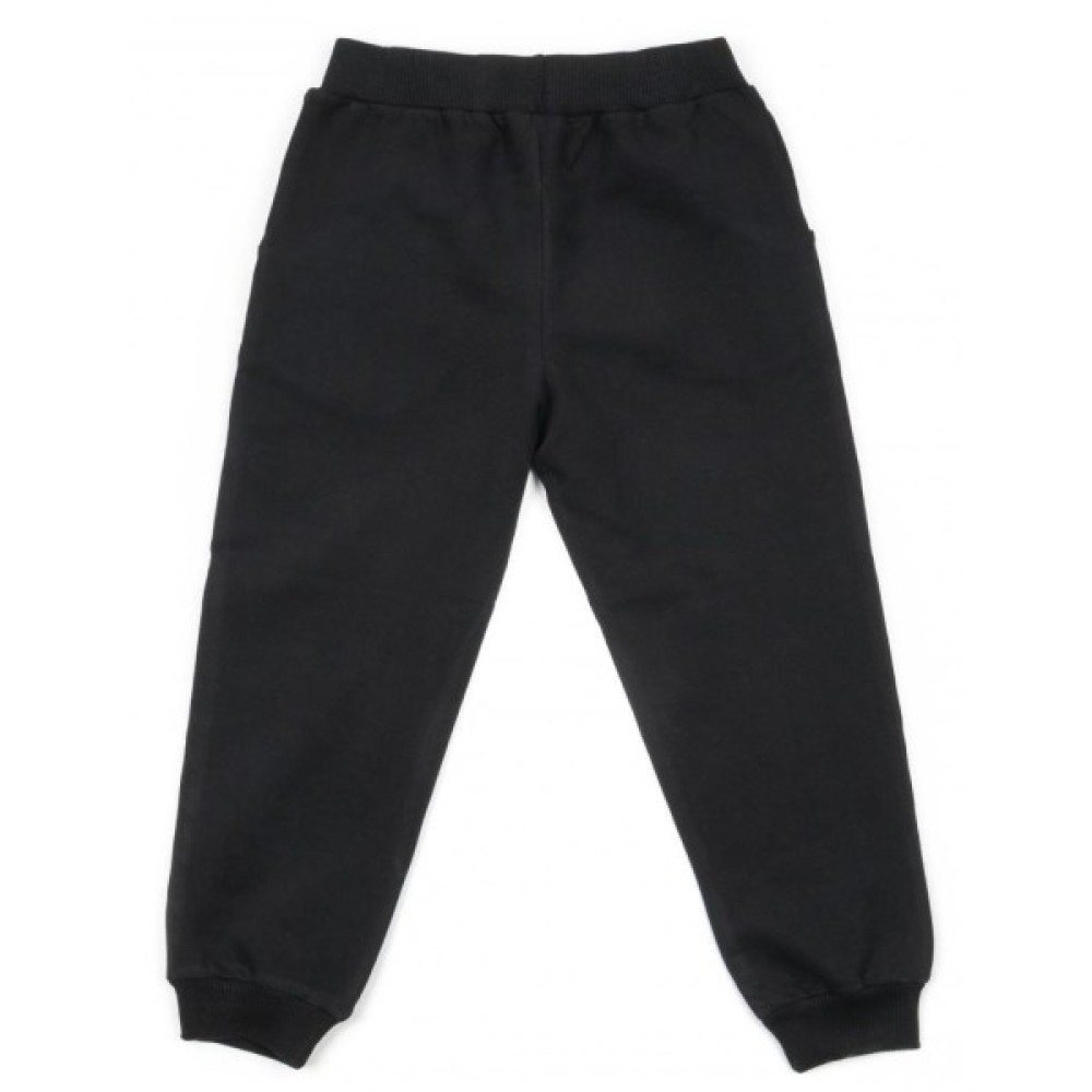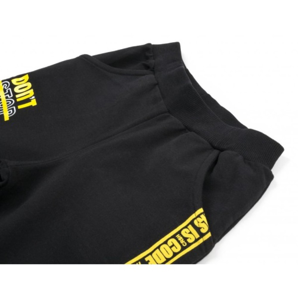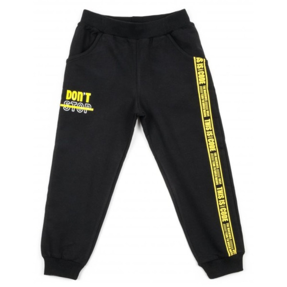 Затишні штани темно - синього кольору, на манжетах, з двома прорізними кишенями, так само прикрашені яскраво - жовтим вертикальним прінтованим написом з різних слів на лівій холоші, а на правій вгорі - поєднанням слів «DO NOT STOP». Написи перегукуються з прінтованнимі написами зі світшота. Еластичний пояс і манжети в подвійну трикотажну «гумку» забезпечать затишок і оптимальну посадку по фігурі. Пояс додатково посилений вставленою всередину широкою «гумкою».