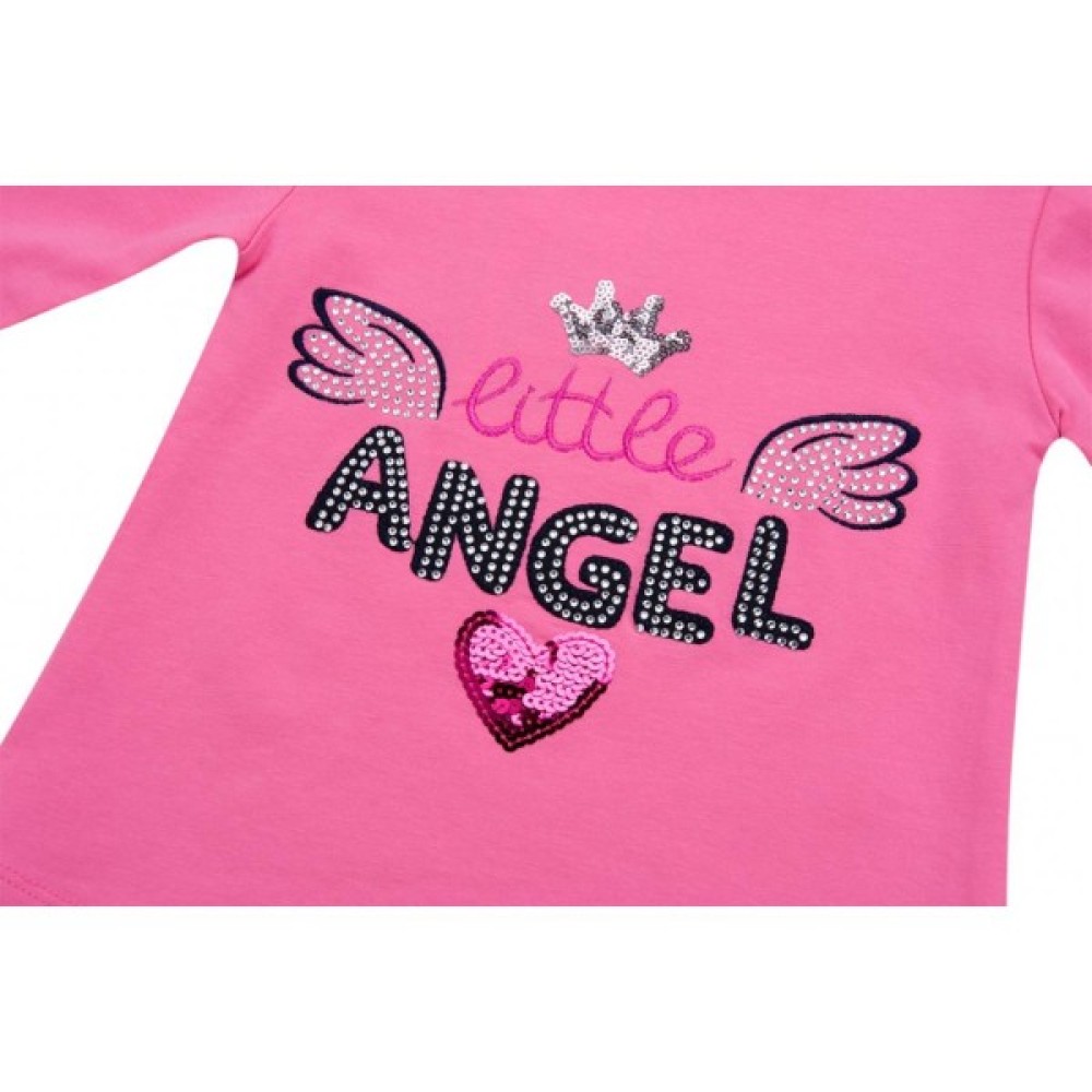 Модний лонгслів з прямим, прісборенним по окату, рукавом без манжета. Прикрашений ефектною аплікацією "little ANGEL" сяючою блискучими стразами. Так само увагу оточуючих приверне чарівна фігурка з сріблястих паєток у вигляді корони і миле сердечко з блискучих малинових паєток. Еластична кругла горловина і м'який трикотаж полегшить процес одягання.