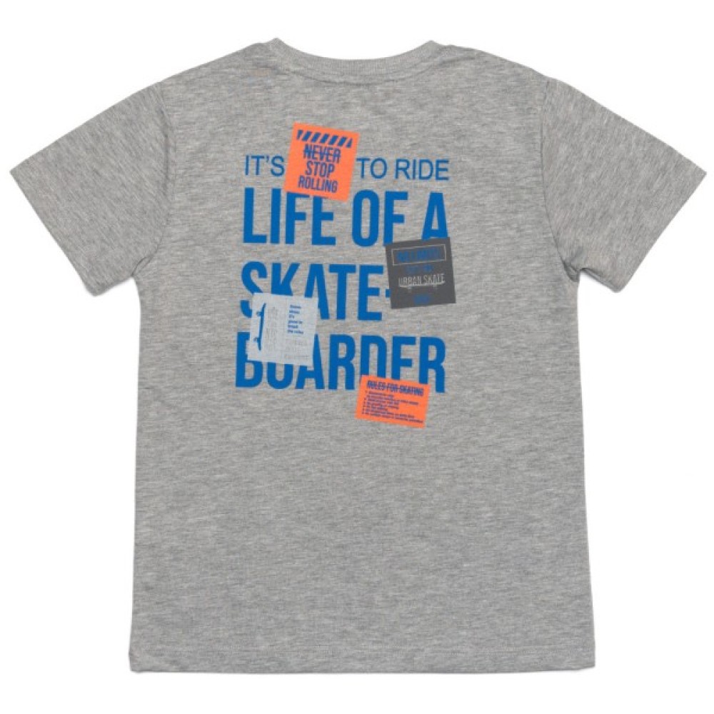 Футболка прямого покрою, з короткими рукавами та круглою горловиною, прикрашена спереду та на спинці стильними ефектними написами та принтовими малюнками на тему скейтбордингу. Горловина оброблена м'якою подвійною трикотажною гумкою.