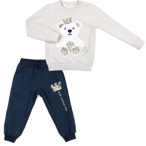 Модний і яскравий костюм для дівчинки в стилі «спортивний шик»: світшот бежевого меланжевого кольору і темно-сині штанці. Костюм зшитий з якісного двуниточного турецького трикотажу на основі натуральної бавовни, з додаванням невеликого % еластану для підтримки форми вироба в процесі носіння. Тканина дуже приємна, бархатиста на дотик.