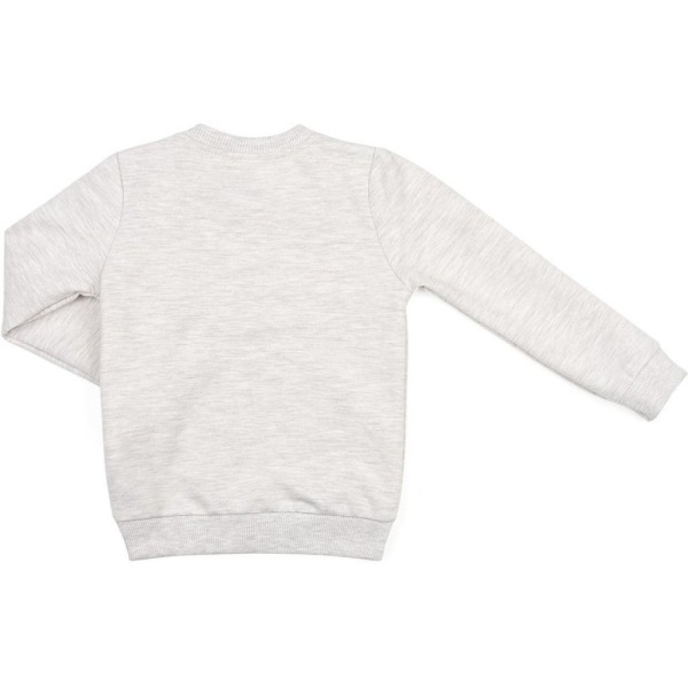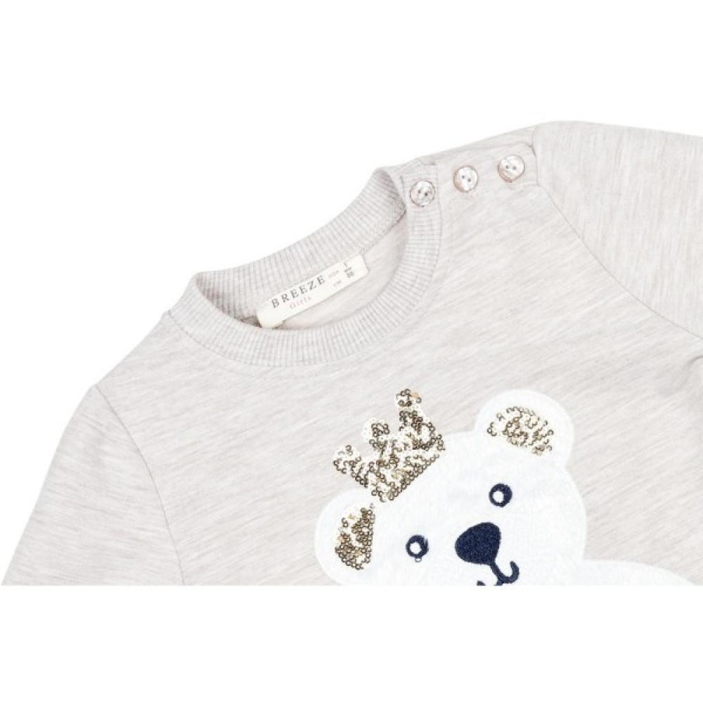 Затишний світшот прямого силуету прикрашений яскравою об'ємною аплікацією ведмедика. Лапки, животик, вушка і коронка на голові ведмедика оформлені золотистими паєтками. Рукава довгі. Кругла горловина, манжети рукавів і низ світшота оброблені подвійною якісною трикотажною «гумкою».