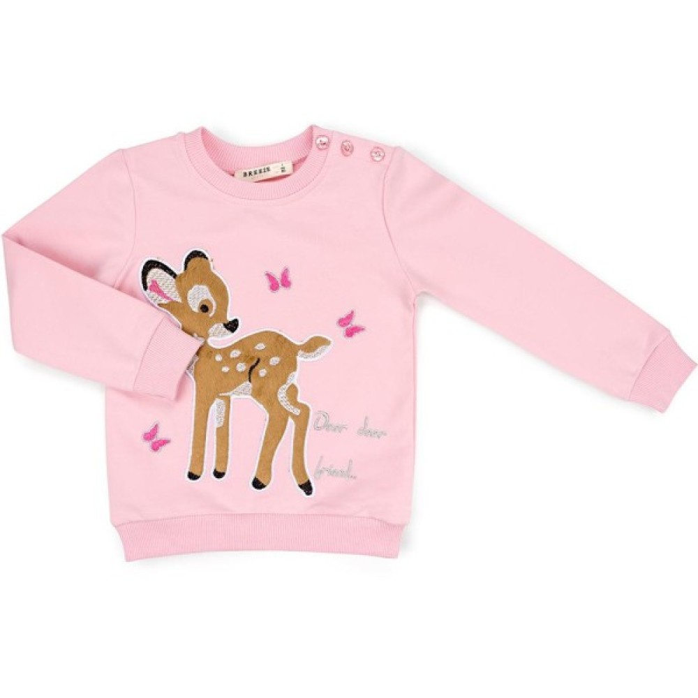 якісно зшитий з м'якого, бархатистого, дуже приємного на дотик, двуниточного трикотажу. Прикрашений настроченою, фактурною аплікацією оленятка в оточенні вишитих гладдю метеликів. Класичний круглий виріз горловини, манжети рукавів і низ світшота оформлені подвійною якісною трикотажною резинкою.