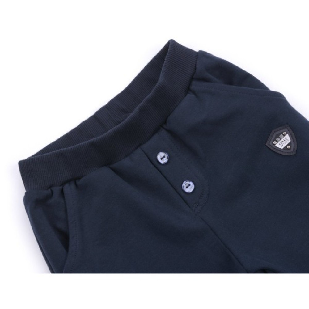 Стильні, модного крою, завужені до низу брюки, темно-синього кольору, з двома прорізними кишенями. Штанці на еластичному поясі з широкою гумкою. По низу модні фіксовані завороти. Прикрашені штани ексклюзивним фірмовим пришивним логотипом.