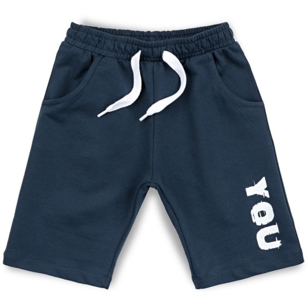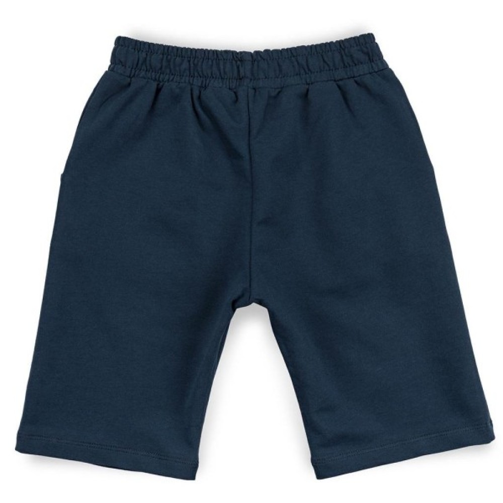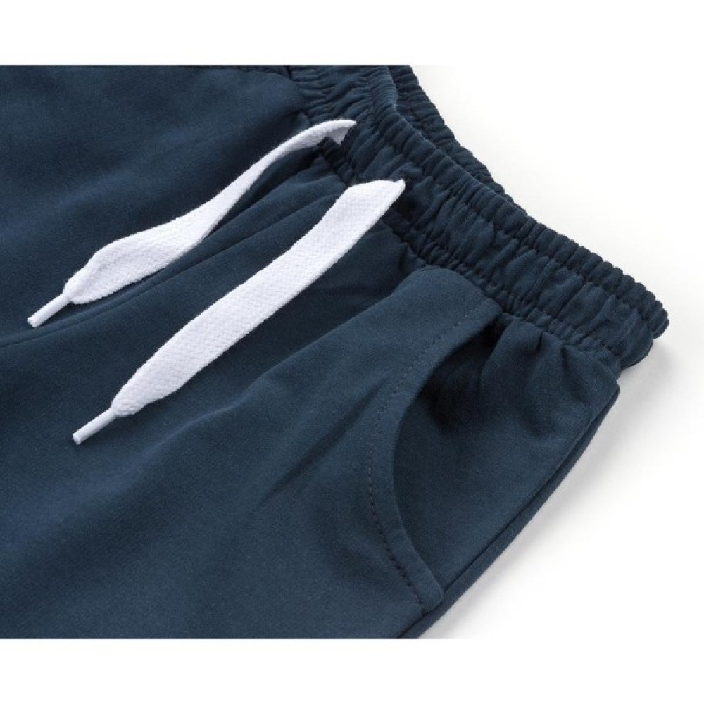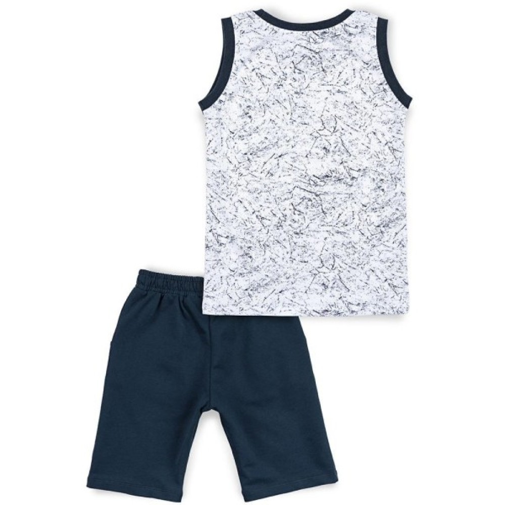 . Тканина у майки тонка, шовковиста, дуже приємна на дотик, літня і дихаюча (100% бавовна). Горловина кругла, оброблена м'якою трикотажною резинкою. Шорти прямі, подовжені, темно-синього кольору, з прорізними кишенями. Пояс середньої ширини, на гумці, доповнений декоративним шнурком білого кольору. Шорти виконані з трохи більш щільної тканини, ніж футболка.