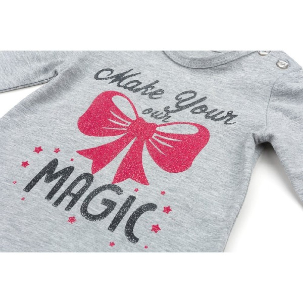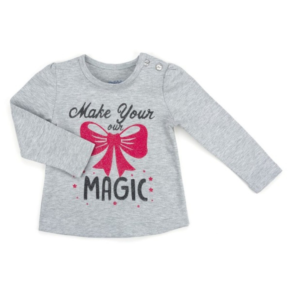 Лонгслів трохи розширеного А-силуету з тонкого трикотажу, спереду прикрашений об'ємним принтом з блискітками у вигляді великого малинового банта, написів та дрібненькі зірочок. Довгі рукава без манжет, призібрані по окату. Лінія низу лонгсліва скруглена. Круглий виріз горловини, оброблений трикотажною бейкою. На лівому плечі застібка на фірмові перламутрові ґудзики, яка полегшить процес одягання.
