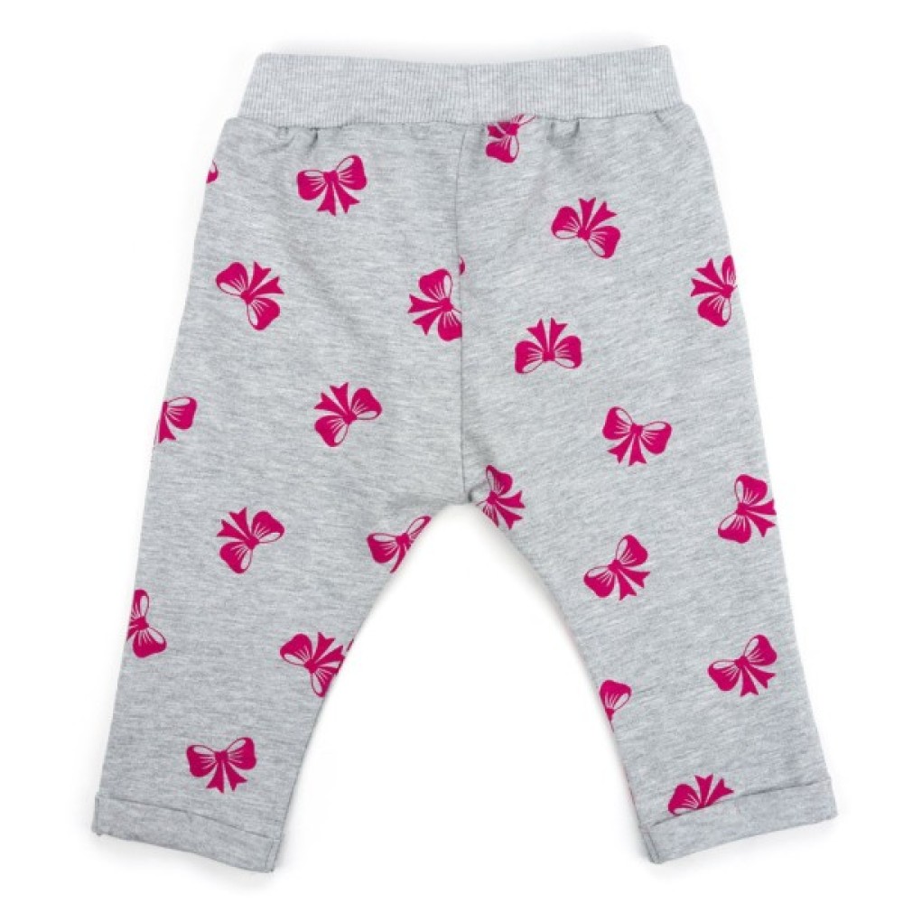 Зручні штанці з двома передніми прорізними кишенями, з тонкого, але плотненького трикотажу з модними фіксованими заворотами по низу. Прикрашені по всій поверхні гарненькими малиновими бантиками. Спереду штани вільні, в поясі зібрані складками і без середнього шва. Еластичний пояс з подвійної трикотажної «гумки», посилений додатково вставленою широкою «гумкою», забезпечить дитині повну свободу рухів і оптимальну посадку по фігурі.