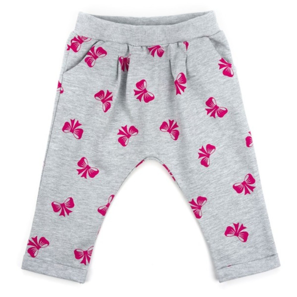 Зручні штанці з двома передніми прорізними кишенями, з тонкого, але плотненького трикотажу з модними фіксованими заворотами по низу. Прикрашені по всій поверхні гарненькими малиновими бантиками. Спереду штани вільні, в поясі зібрані складками і без середнього шва. Еластичний пояс з подвійної трикотажної «гумки», посилений додатково вставленою широкою «гумкою», забезпечить дитині повну свободу рухів і оптимальну посадку по фігурі.