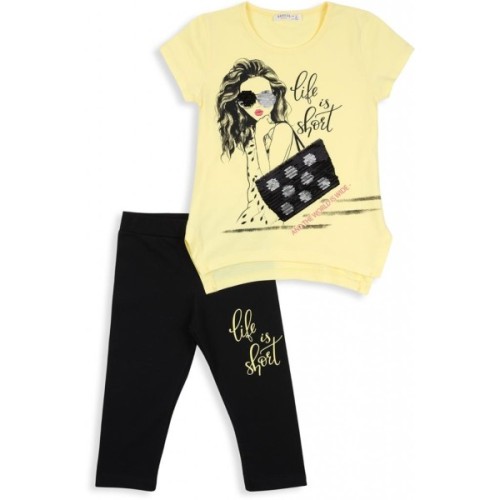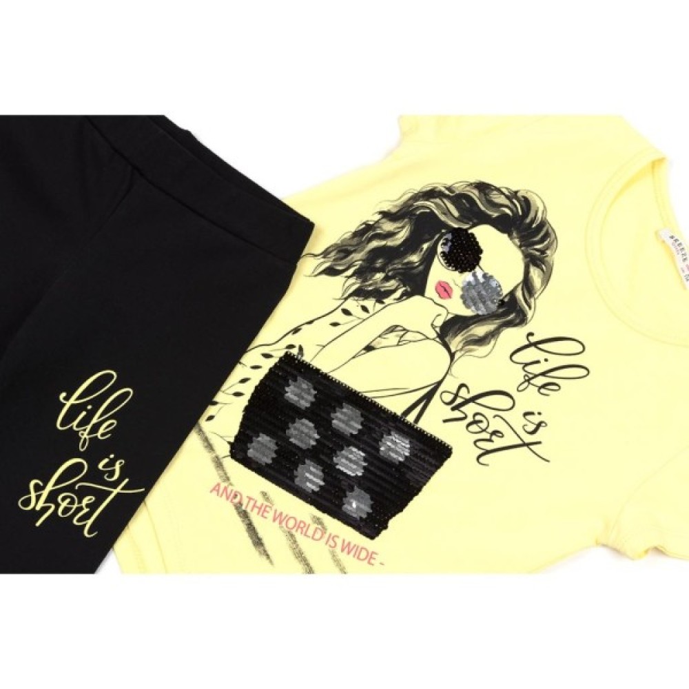 Стильний комплект - двійка з тонкого турецького трикотажу для Вашої модниці: лимонного кольору футболка і дуже темно - сині лосини.