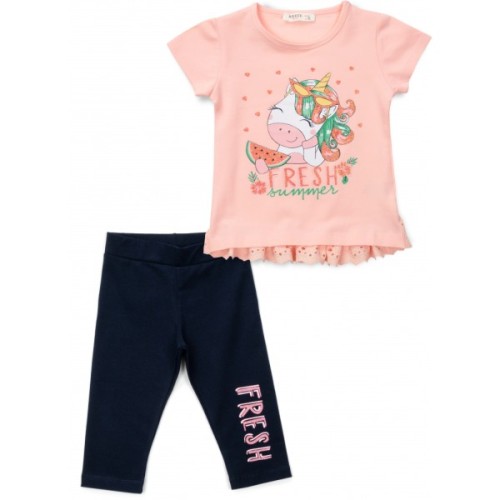 Дуже класний, модний комплект для дівчинки з тонкого бавовняного турецького трикотажу, дуже приємного на дотик: персикова футболка з мереживною оборкою та темно-сині бриджики.