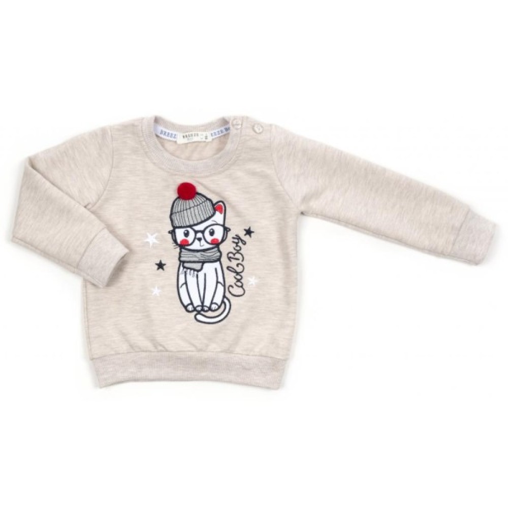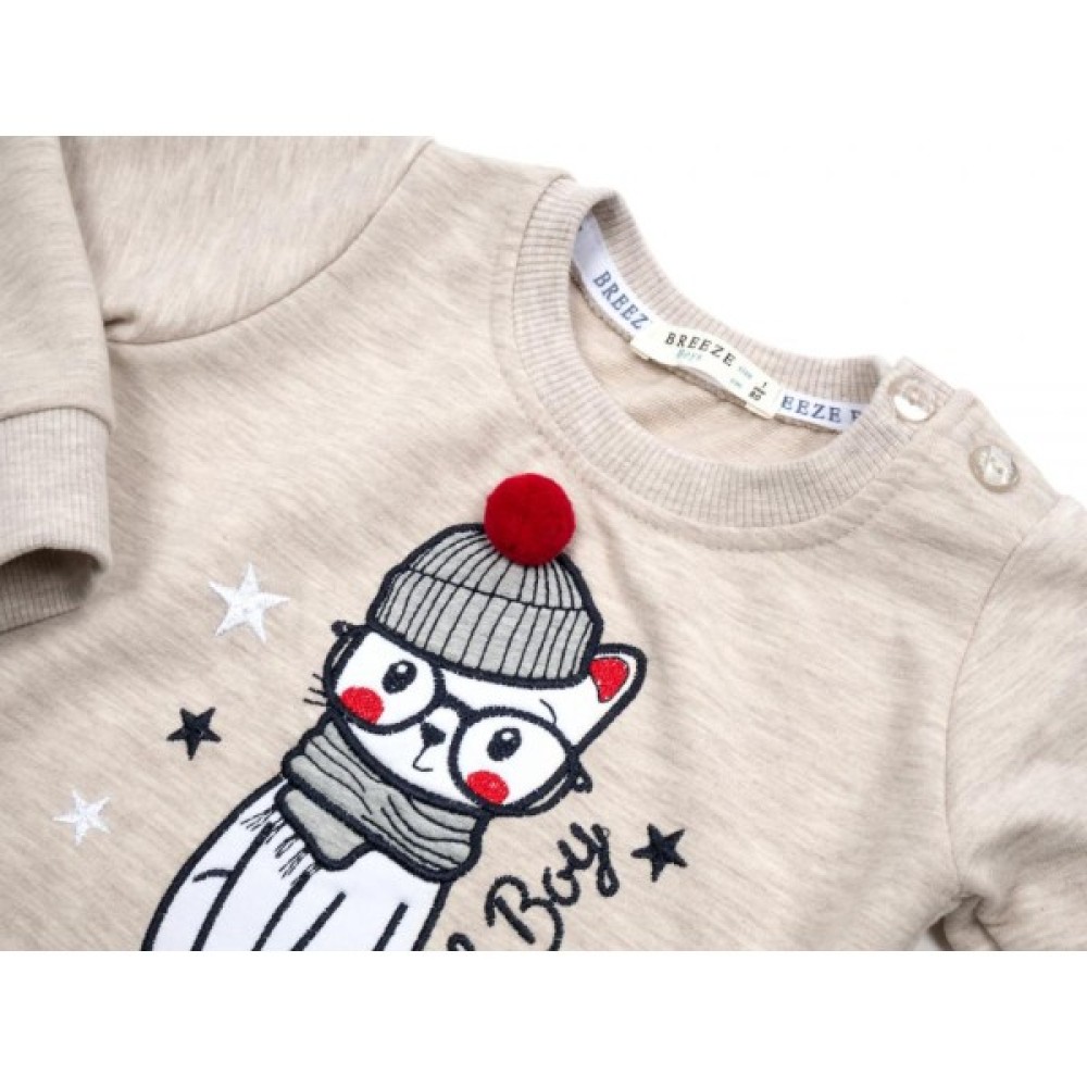 Світшот прямого силуету, з довгими рукавами, прикрашений яскравою аплікацією котика. Круглий виріз горловини, лінія низу світшота і манжети рукавів оформлені подвійною трикотажною резинкою. На лівому плечі застібка на фірмові перламутрові ґудзики, яка полегшить процес надягання.