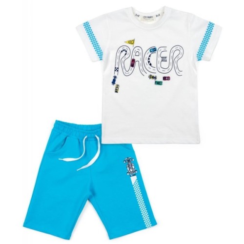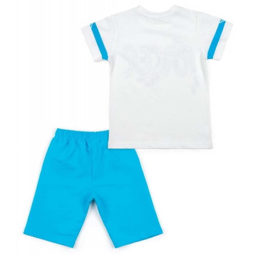 Чудовий, яскравий літній комплект відмінної якості для юного автогонщика: біла футболка і блакитні шорти-бермуди. Комплект виконаний з тонкого, дихаючого, бавовняного турецького трикотажу, м'якого і приємного на дотик – 100% бавовна.