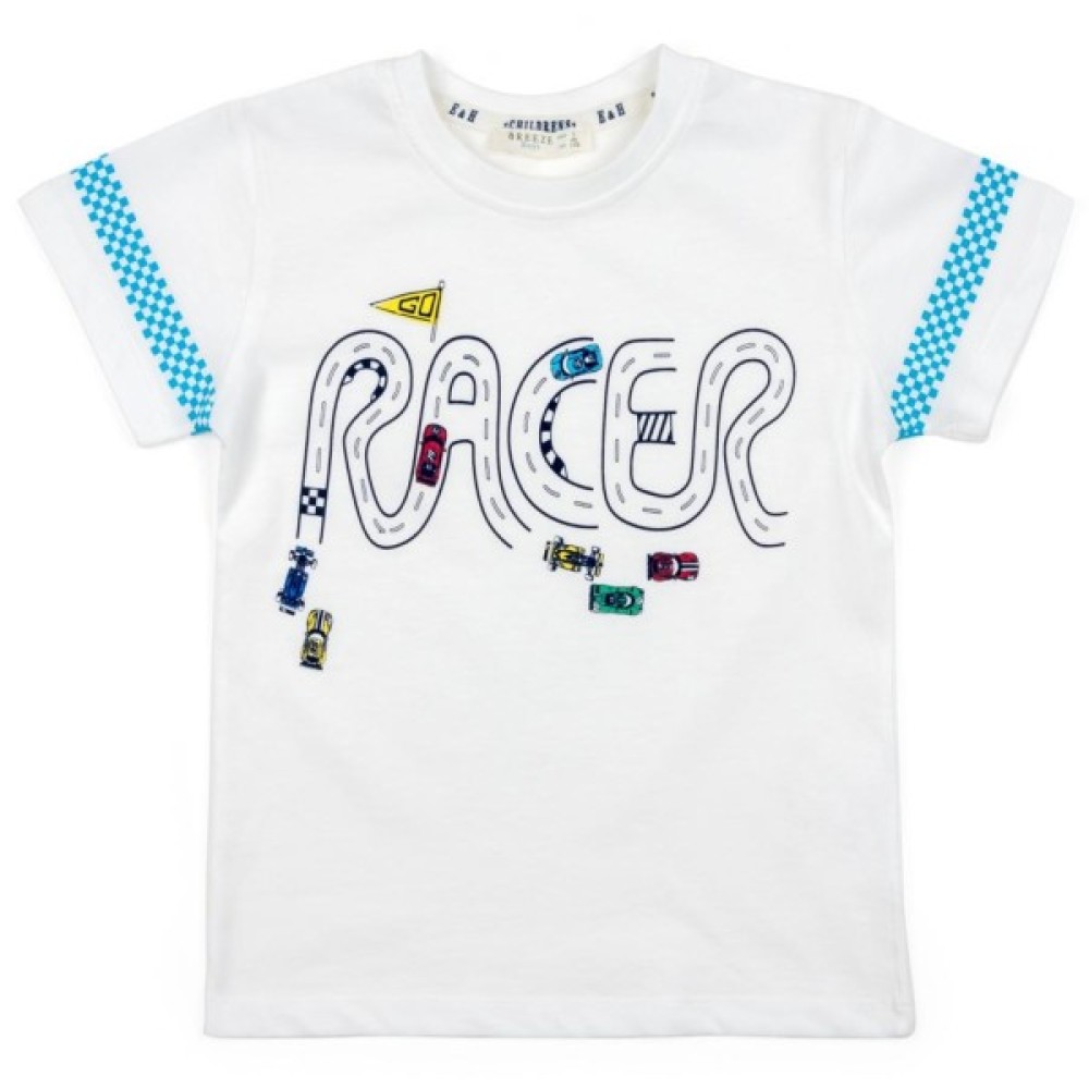 Футболка прямого покрою, з короткими рукавами і круглою горловиною. Прикрашена спереду об'ємним принтом гоночної траси у вигляді слова «RACER» і різнокольоровими гоночними болідами, а також гоночною атрибутикою на рукавах, у вигляді картатої фінішної лінії. Горловина оброблена м'якою подвійною трикотажною резинкою. На лівому плечі застібка на фірмові, перламутрові ґудзики, яка полегшить процес одягання (для розмірів 86 і 92).