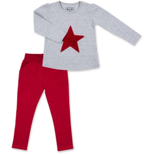 У комплект входять сірого меланжевого забарвлення лонгслів і штани глибокого червоного кольору.
