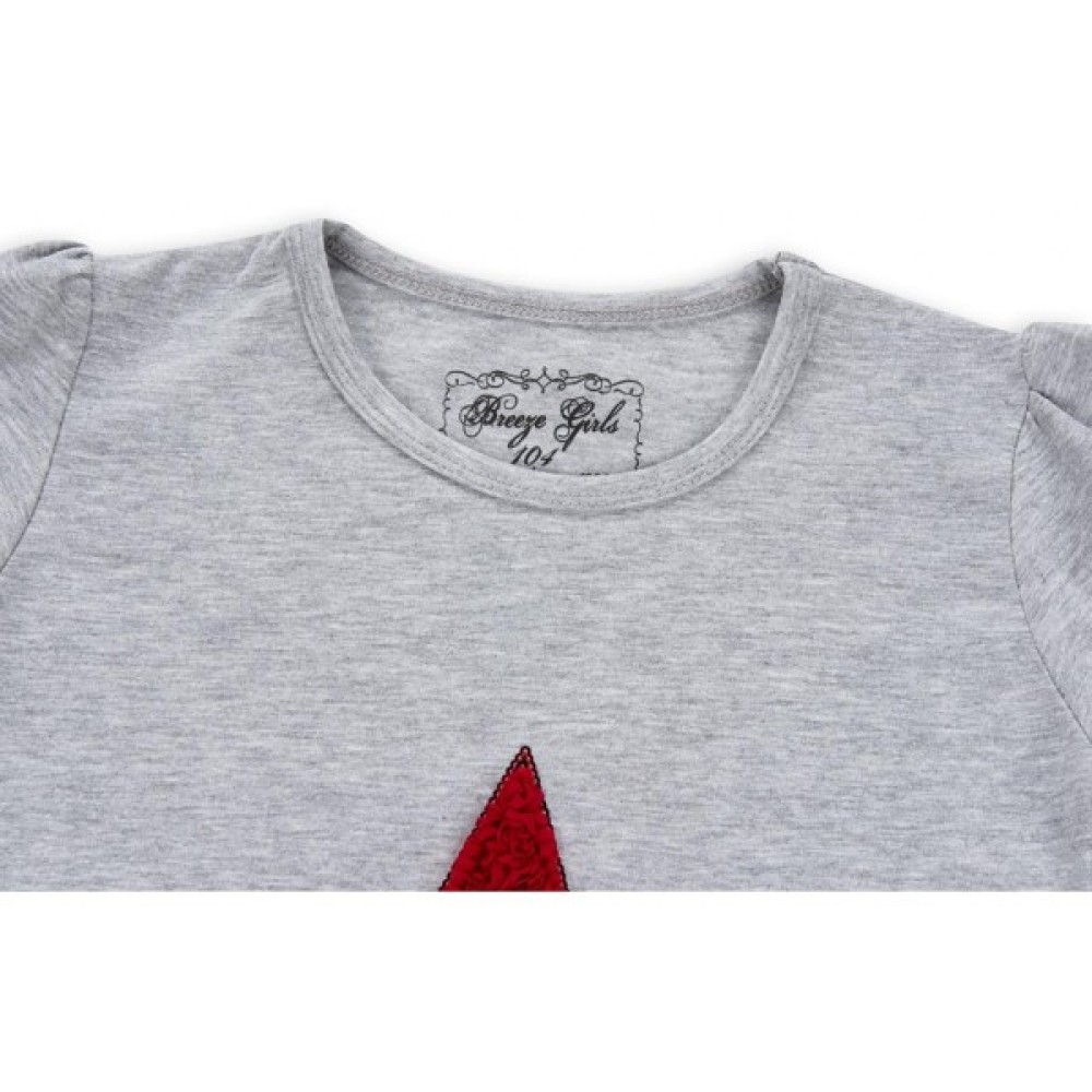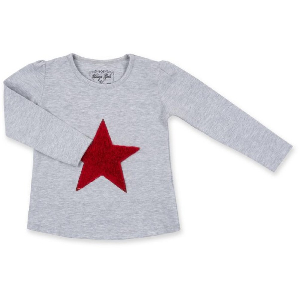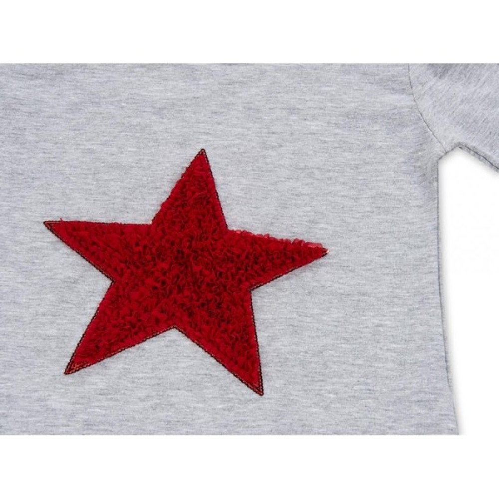 Затишний лонгслів (Лонгслів - запозичене слово і в перекладі з англійської означає long - довгий, sleeve - рукав, а все разом - футболка з довгим рукавом) А-образної форми з довгими рукавами. Класичний круглий виріз горловини оформлений трикотажною бейкою. Прикрашає цей лонгслів яскрава аплікація червоного кольору в формі зірки, зробленая з шифонових стрічок. Зірка по контуру оформлена паєтками.