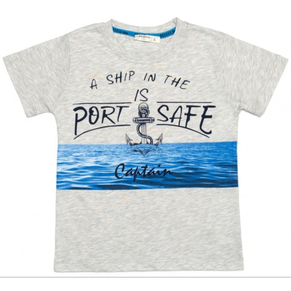 Футболка прямого крою з коротким рукавом та круглою горловиною. Горловина оброблена подвійною, м'якою тонкою трикотажною гумкою. Попереду футболка прикрашена об'ємним малюнком на морську тематику з принтовими написами.