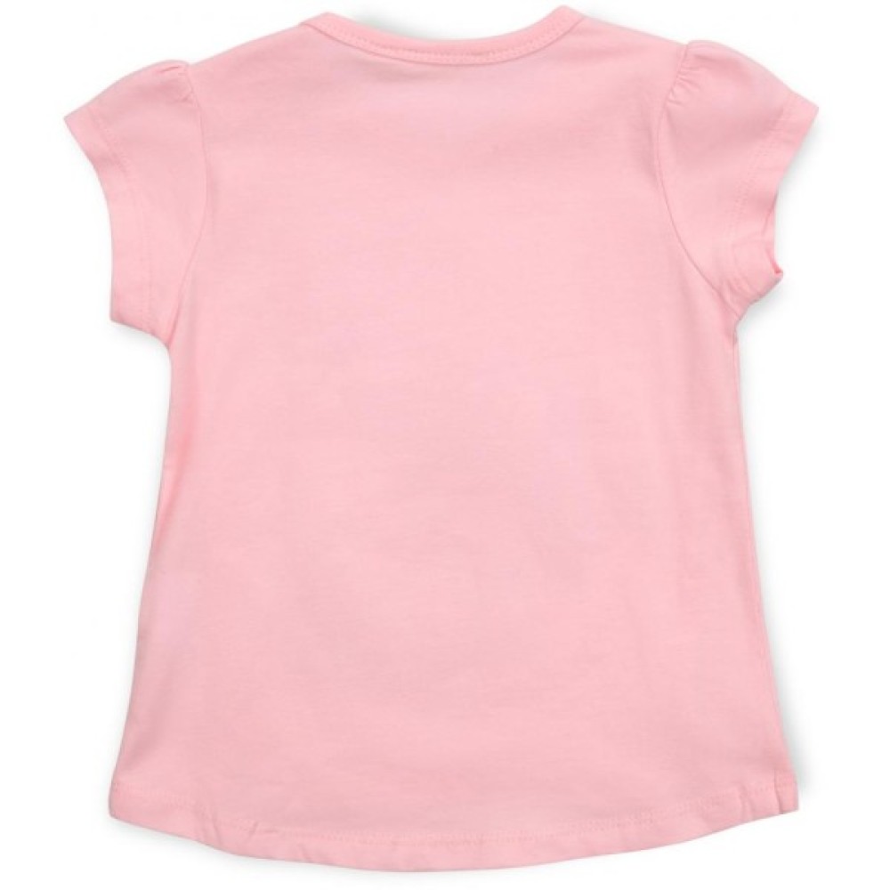 Затишна і дуже мила футболка з коротким рукавом, трохи призібраними по окату. Прикрашена дуже красивим об'ємним принтовим малюнком з милим слоником і шифоновими квіточками. Круглий виріз горловини оброблений трикотажною м'якою бейкою. На лівому плечі застібка на фірмові, перламутрові ґудзики, яка полегшить процес одягання (для розмірів 86, 92 і 98). Лінія спинки трохи довша за лінію переду.