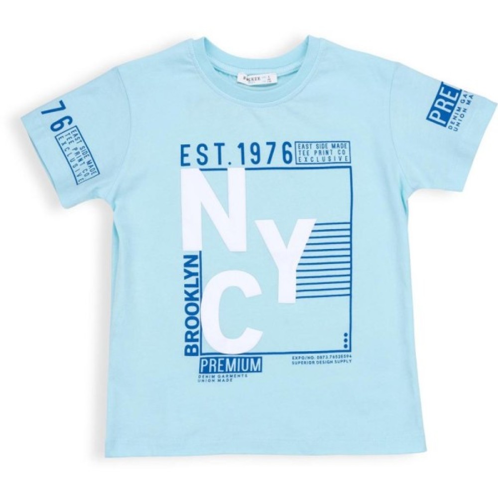 Ніжно-блакитного відтінку футболка прямого силуету з об'ємним принтом спереду. Горловина кругла, оброблена м'якою трикотажною резинкою. Шорти середньої довжини яскравого синього кольору з двома прорізними кишенями. Пояс еластичний на гумці з декоративним шнурком.