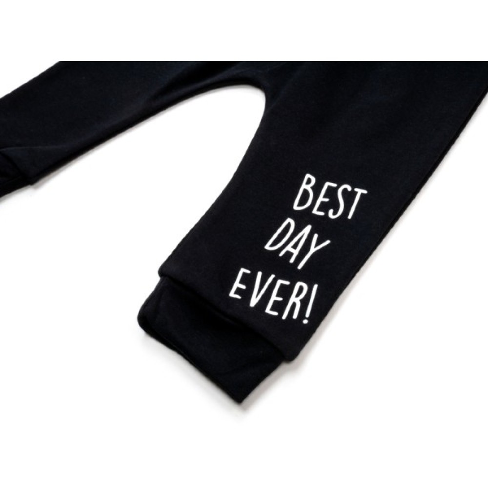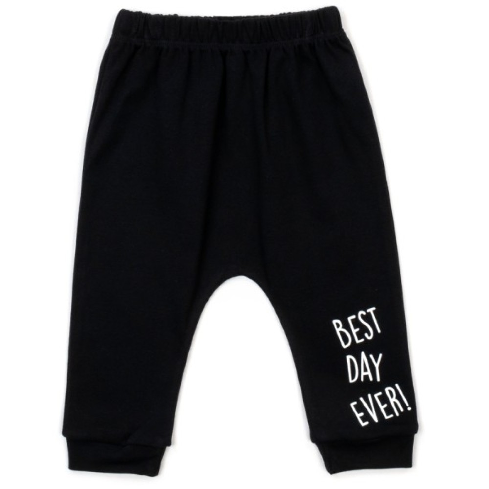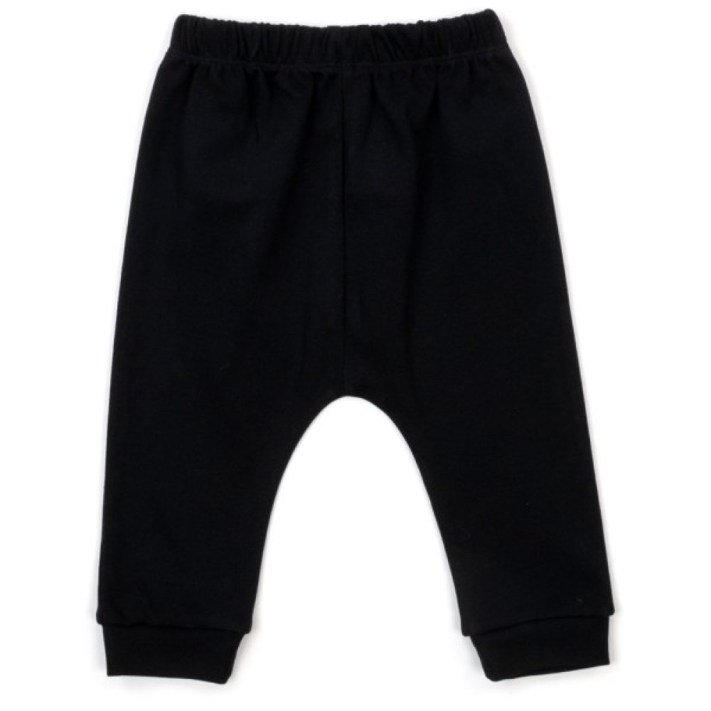 Штанці чорного кольору, знизу на манжетах, з низькою посадкою під підгузок, на еластичному поясі з гумкою всередині. Штанці - 100% бавовна.