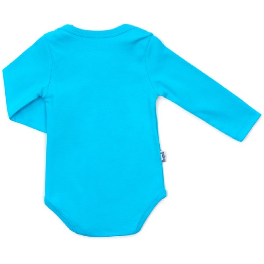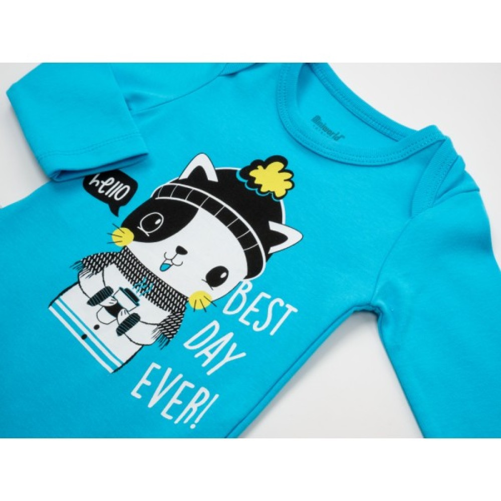 Боді насиченого блакитного кольору, з довгими рукавами, прикрашений гарним принтом котика. Застібається боді внизу на дві кнопочки, плічка саморозкривні, що дуже зручно при надіванні боді. Боді - 100% бавовна.