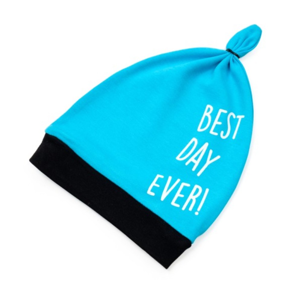 Шапочка блакитного кольору, з відворотом чорного кольору, прикрашена принтованим написом best day ever!