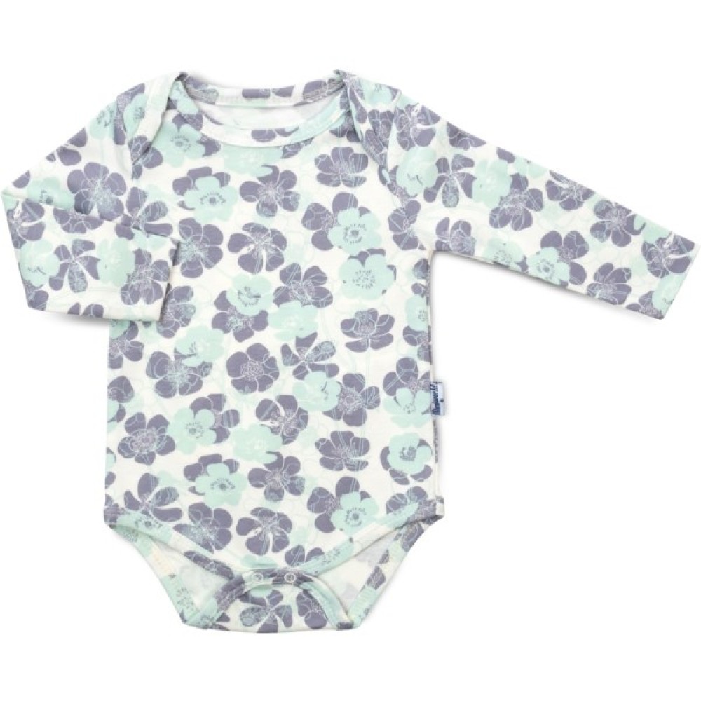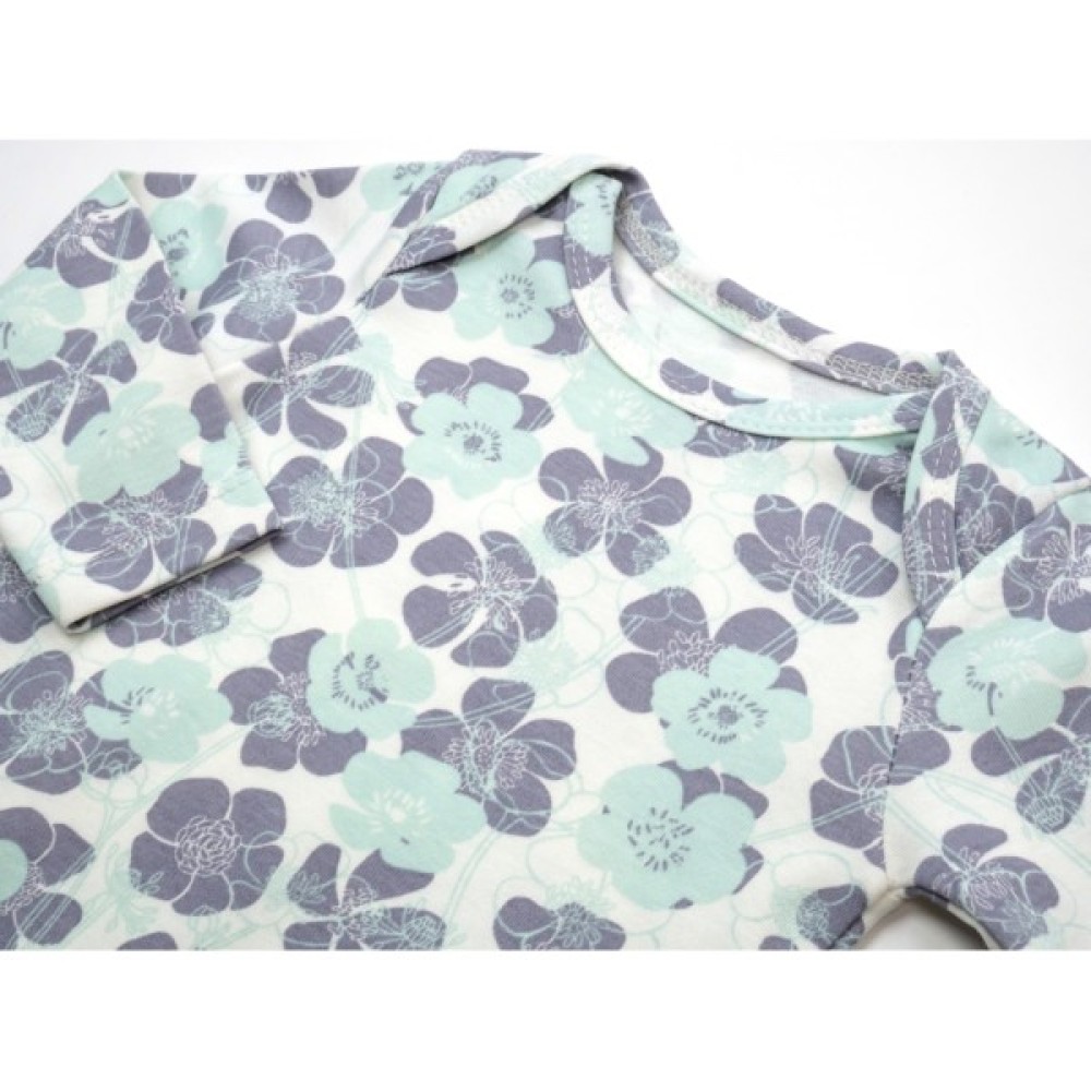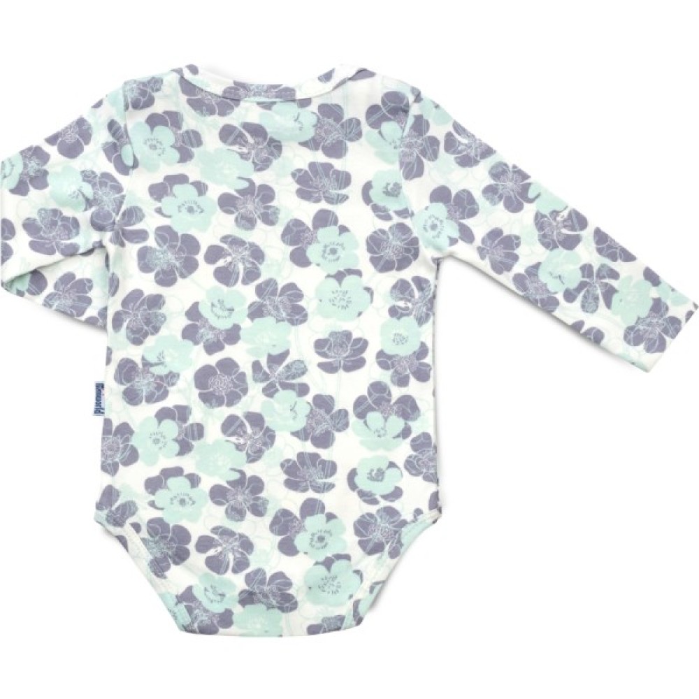 Боді кремового кольору в квіточки - сірі та блідого кольору м'яти, з довгими рукавами. Застібається боді внизу на дві кнопочки, плічка саморозкривні, що дуже зручно при надяганні боді.