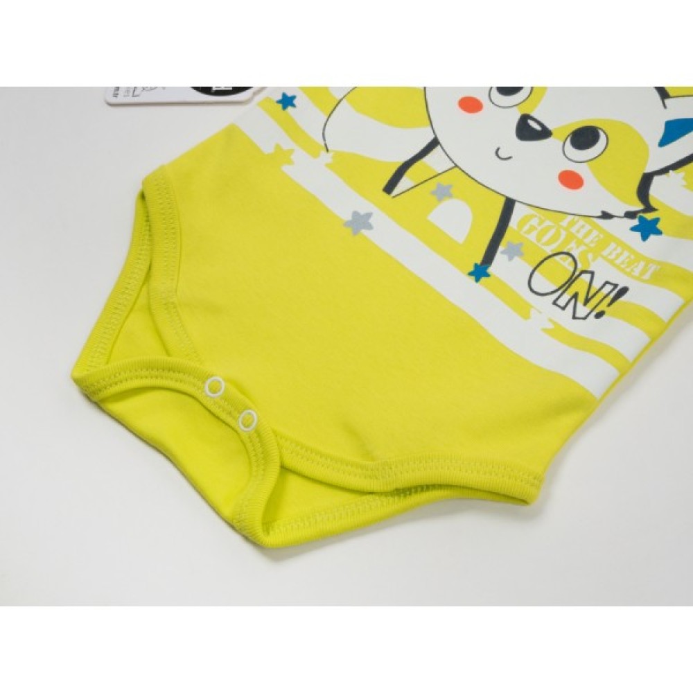 • Боді з довгими рукавами, застібкою внизу, між ніжками, на дві кнопочки, та з горловиною-човником з запАхом на плечиках, що дуже зручно при надяганні. Боді виконаний з трикотажу приємного салатового кольору та прикрашений веселим кольоровим принтовим малюнком симпатичного єнотика.