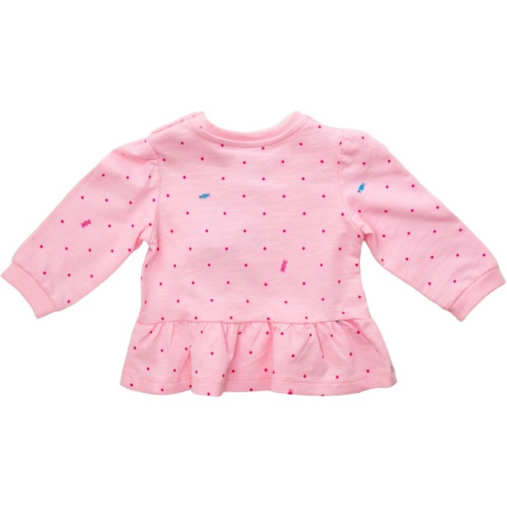 - Кофточка прямого напіввільного силуету, з довгими вшивними рукавами на манжетах та призібраною оборочкою по низу. На лівому плечі виконана застібка на кнопочки, яка полегшить процес одягання. Кофтинка прикрашена милими кольоровими принтовими малюночками та аплікацією цукерочки. Принт не боїться прасування.
