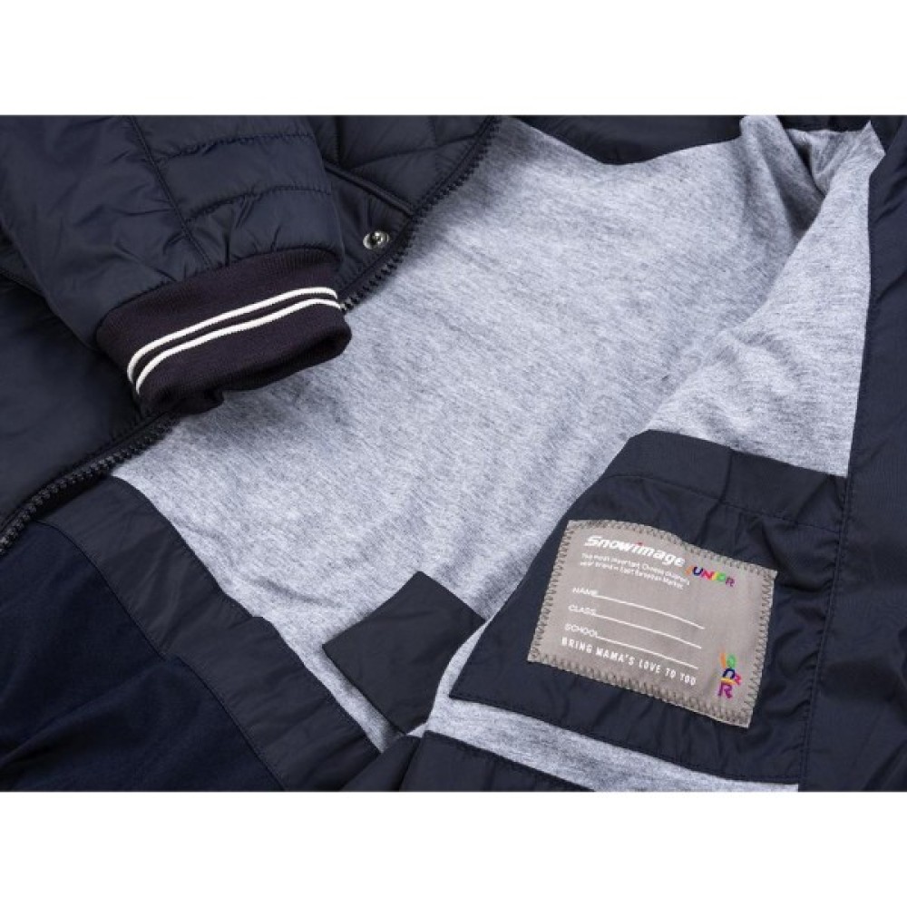 Затишна темно-синя курточка прямого силуету, з коміром-стійкою і з’ємним трикотажним капюшоном, що відстібається. Верх куртки і рукава красиво, фактурно вистьобані разом із шаром утеплювача, тому при пранні він не буде збиватися в ком. Внутрішня верхня частина основи куртки на підкладці з бавовняного трикотажу, що забезпечує ще більший комфорт. Низ куртки і рукавів зібраний на м'яку трикотажну гумку хорошої щільності з тонкими білими смужками по середині. По краю капюшона регульована кулиска з тонкою, круглою гумкою і стопорами. Куртка застібається на якісну, капронову тракторну блискавку з дуже легким ходом і вітрозахисну планку на внутрішніх кнопках. Спереду на поличках 2 вертикальних кишені із застібкою на блискавку, виконані в рельєфних швах, і одна внутрішня кишеня із застібкою на липучку. На лівому рукаві трикутний, глянцевий фірмовий логотип.