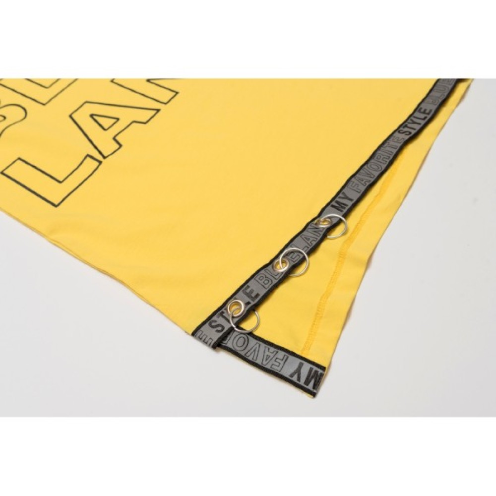 Спереду сукня прикрашена об'ємними принтовими написами, а по лінії низу та на рукавах модними світловідбиваючими стрічками з металевими кільцями та люверсами. Овальна горловина оброблена еластичною трикотажною обтачкою.