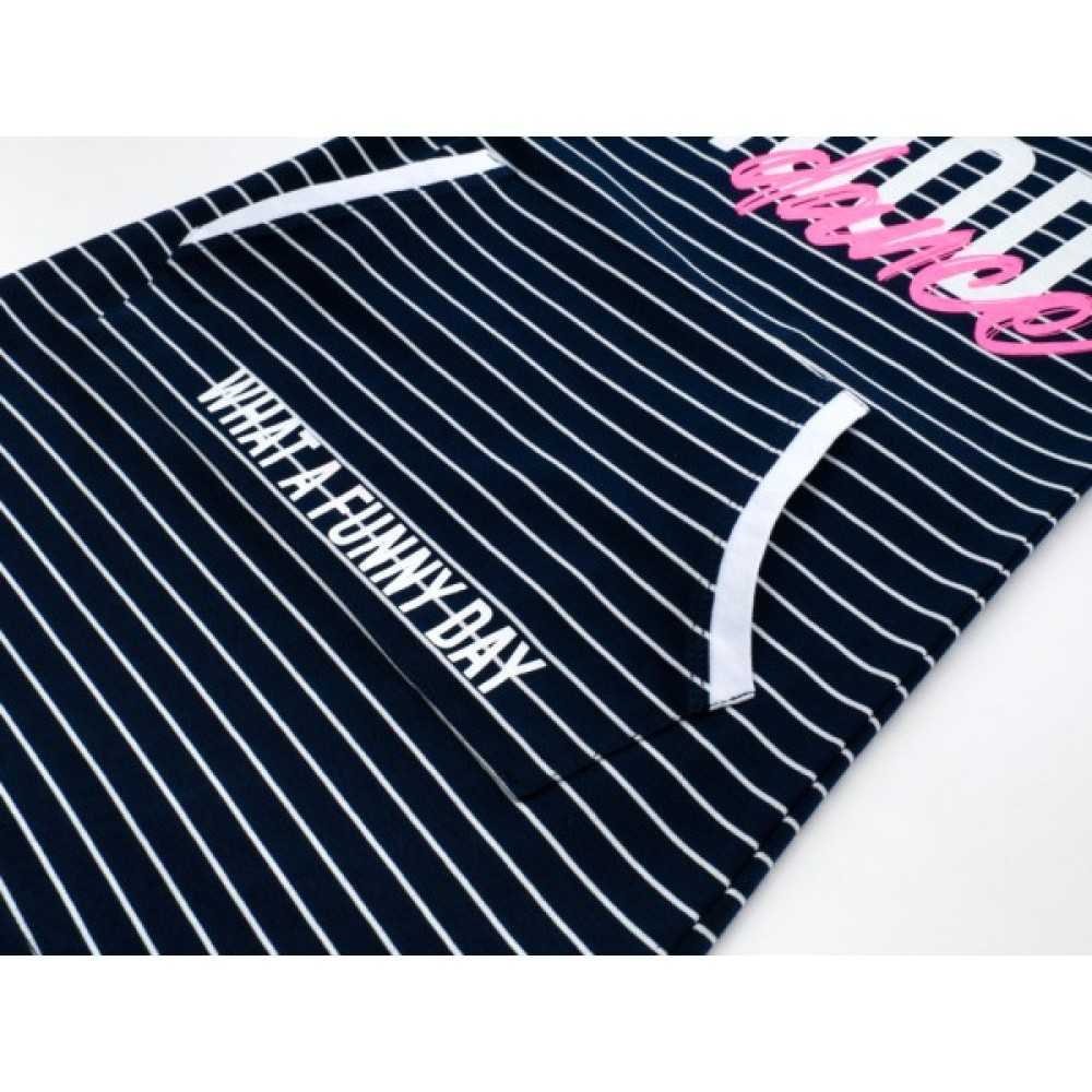 • Комфортна, стильна смугаста трикотажна сукня А-силуету з короткими рукавами та накладною кишенею-кенгуру - відмінний літній варіант для вашої юної модниці в спекотну літню погоду.