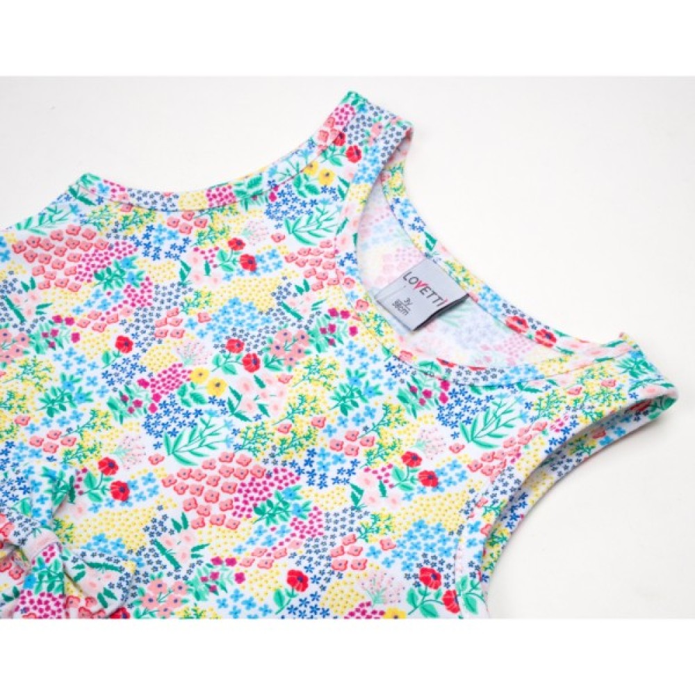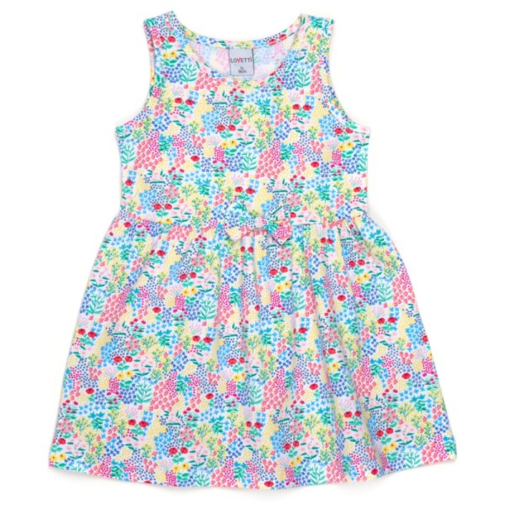 • Чудова, легка кольорова трикотажна сукня-сарафан без рукавів, з неймовірно позитивним приємним квітковим візерунком - відмінний літній варіант для вашої донечки в спекотну літню погоду.