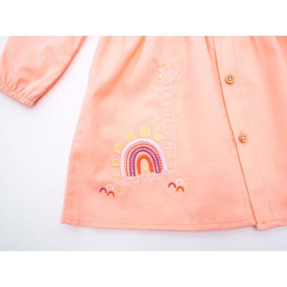 • Симпатична, легка персикова сукня з довгим рукавом, прикрашена симпатичними кольоровими вишивками та аплікацією.