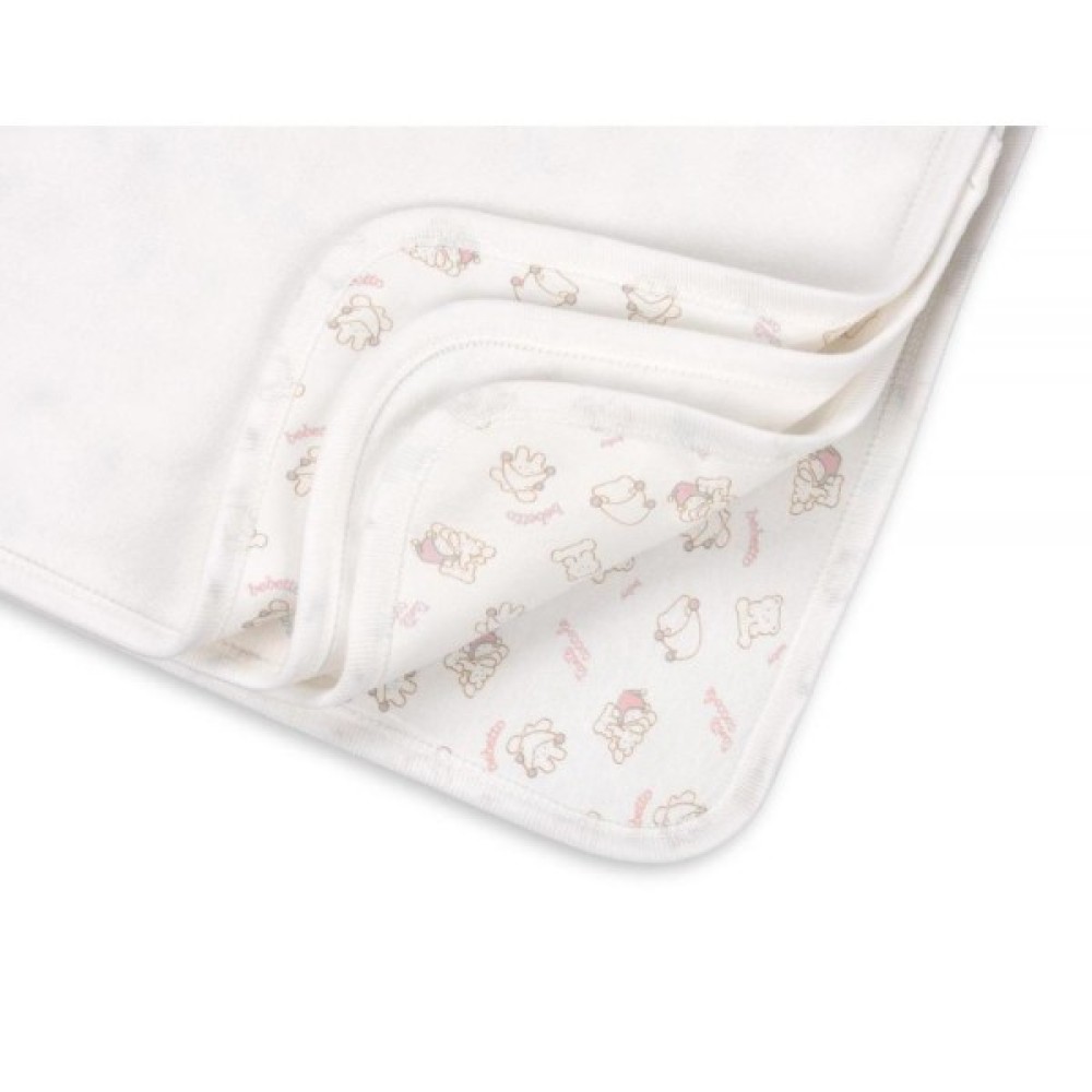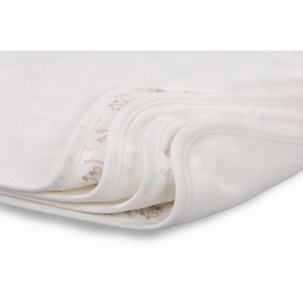Одна сторона - м'який і ніжний велюр з коротким ворсом на трикотажній основі (80% бавовни, 20% поліестеру), друга – бавовняний, дуже м'який трикотаж (100% бавовна) з маленькими кумедними дитячими фігурками в ніжно-пастельних тонах. Ковдра навколо окантована м'якою трикотажною резинкою. Лицьовою може бути будь-яка зі сторін, за Вашим бажанням.
