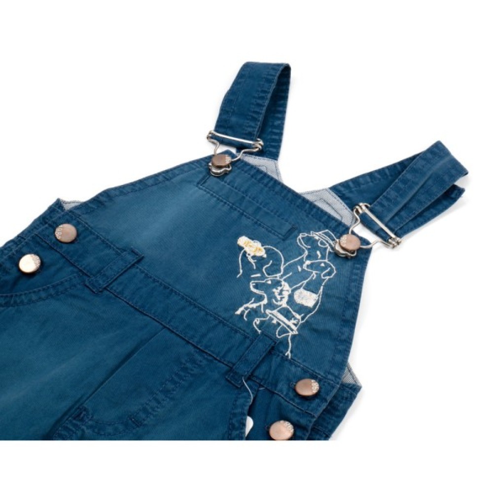 - Комбінезон має дві бокові прорізні передні кишені, ззаду дві накладні кишені з оздоблювальними рядками, а на грудях кишеню-обманку.