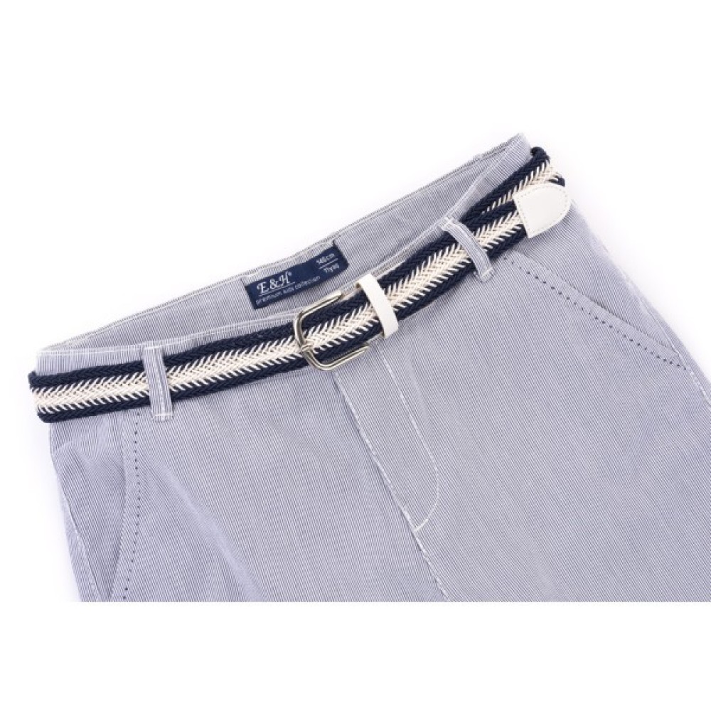 Стильні, світлі, елегантні шорти-бермуди покрою «5 кишень» в дрібну синю смужку для юного джентельмена. Зручна стандартна посадка. Застібаються на ґудзик і міцну металеву блискавку з фіксатором. Спереду - 2 прорізних кишені, а ззаду - 2 врізні з лісточками. На поясі ззаду всередині вшита резинка для регулювання об’єму талії, що забезпечить максимальний затишок і комфорт. Укомплектовані класним плетеним ременем.