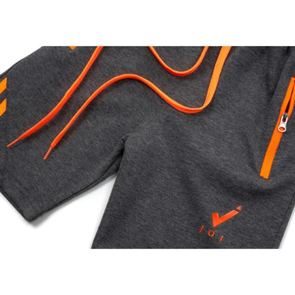 Стильна і зручна трикотажна модель темно - сірого меланжевого кольору з обробкою яскравими, неоновими смужками і шнурком.