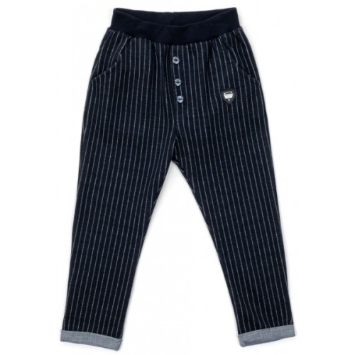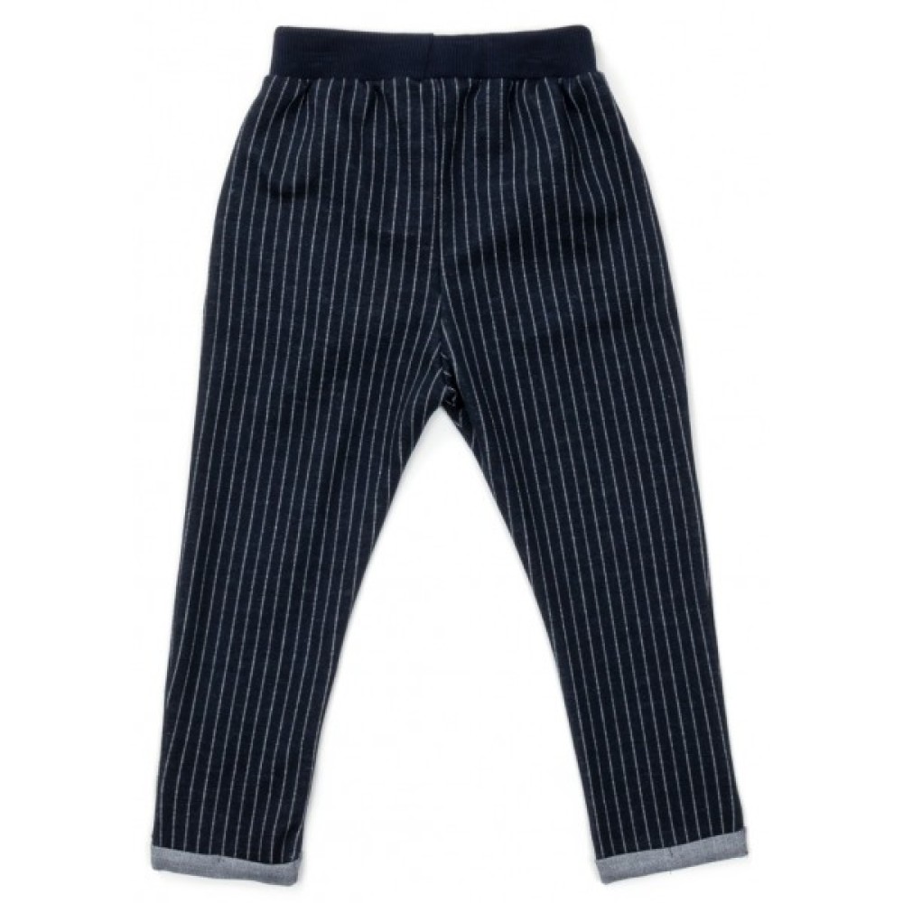 Зручні, трикотажні штани темно-синього кольору у вузьку вертикальну смужку, зі скошеними передніми, прорізними кишенями та модними, підгорнутими, фіксованими манжетами-підворотами знизу.